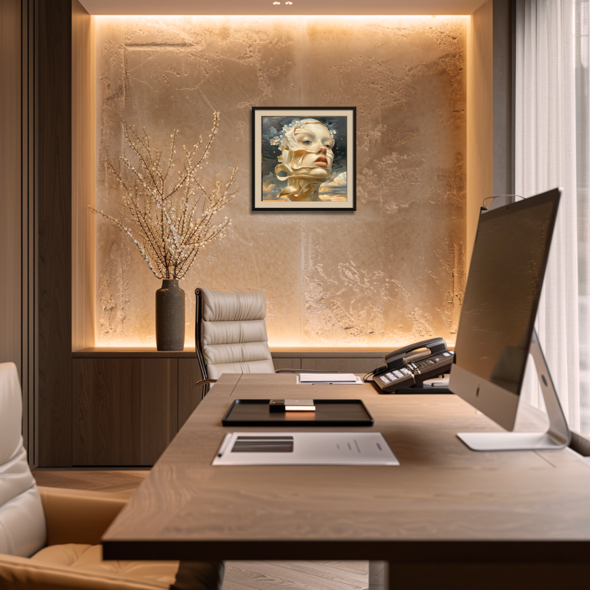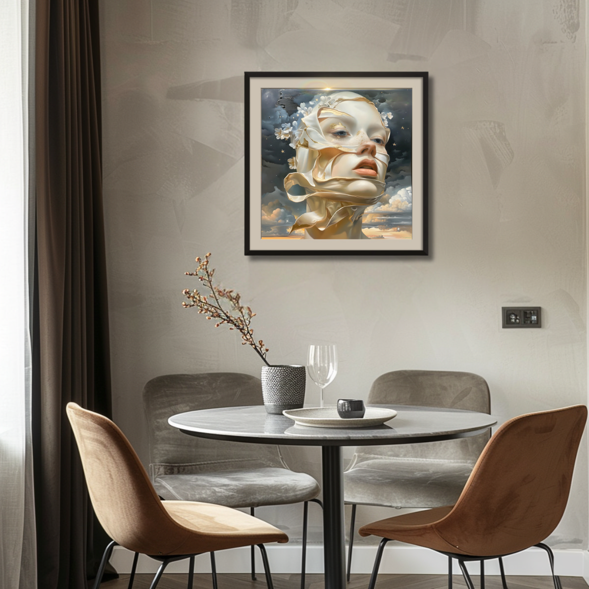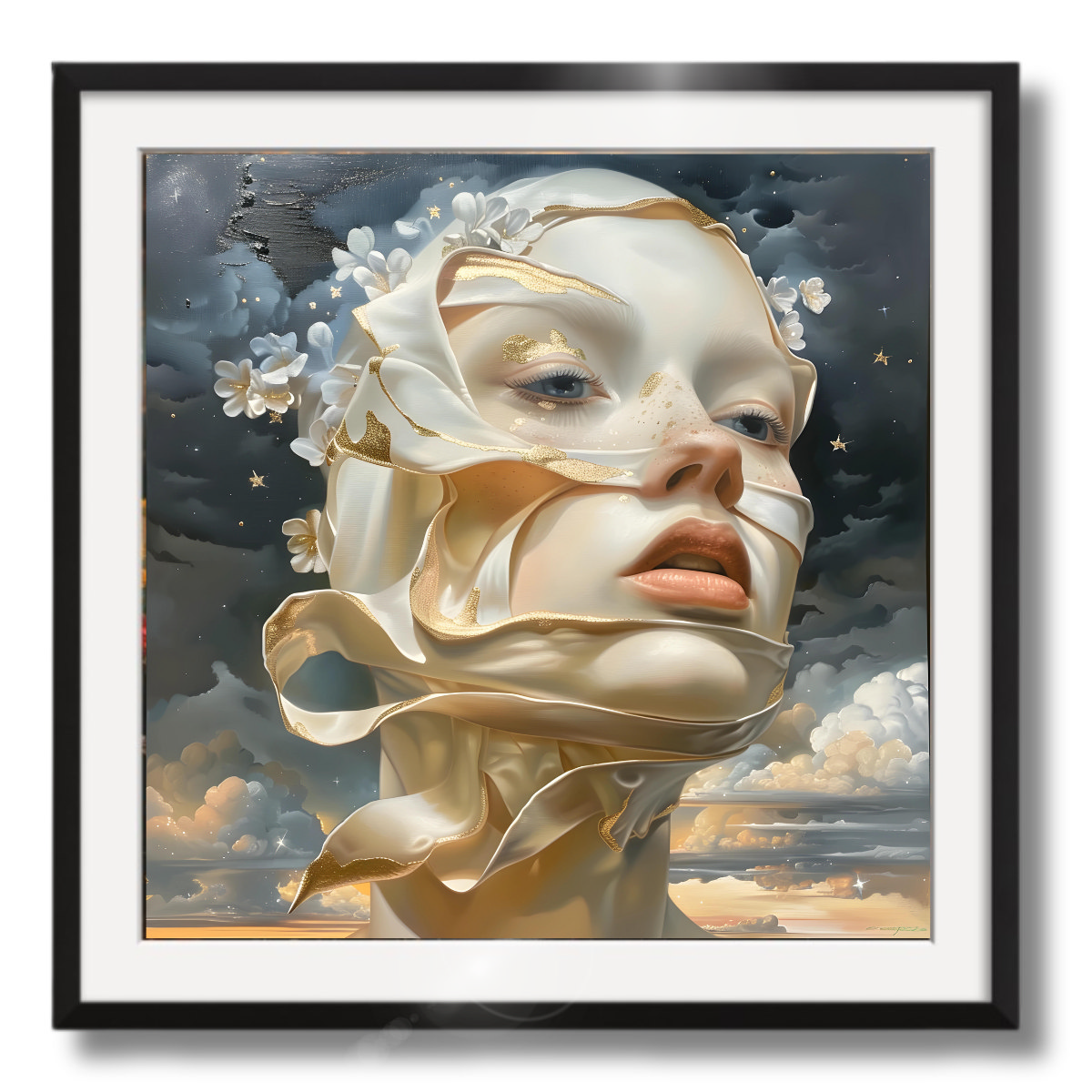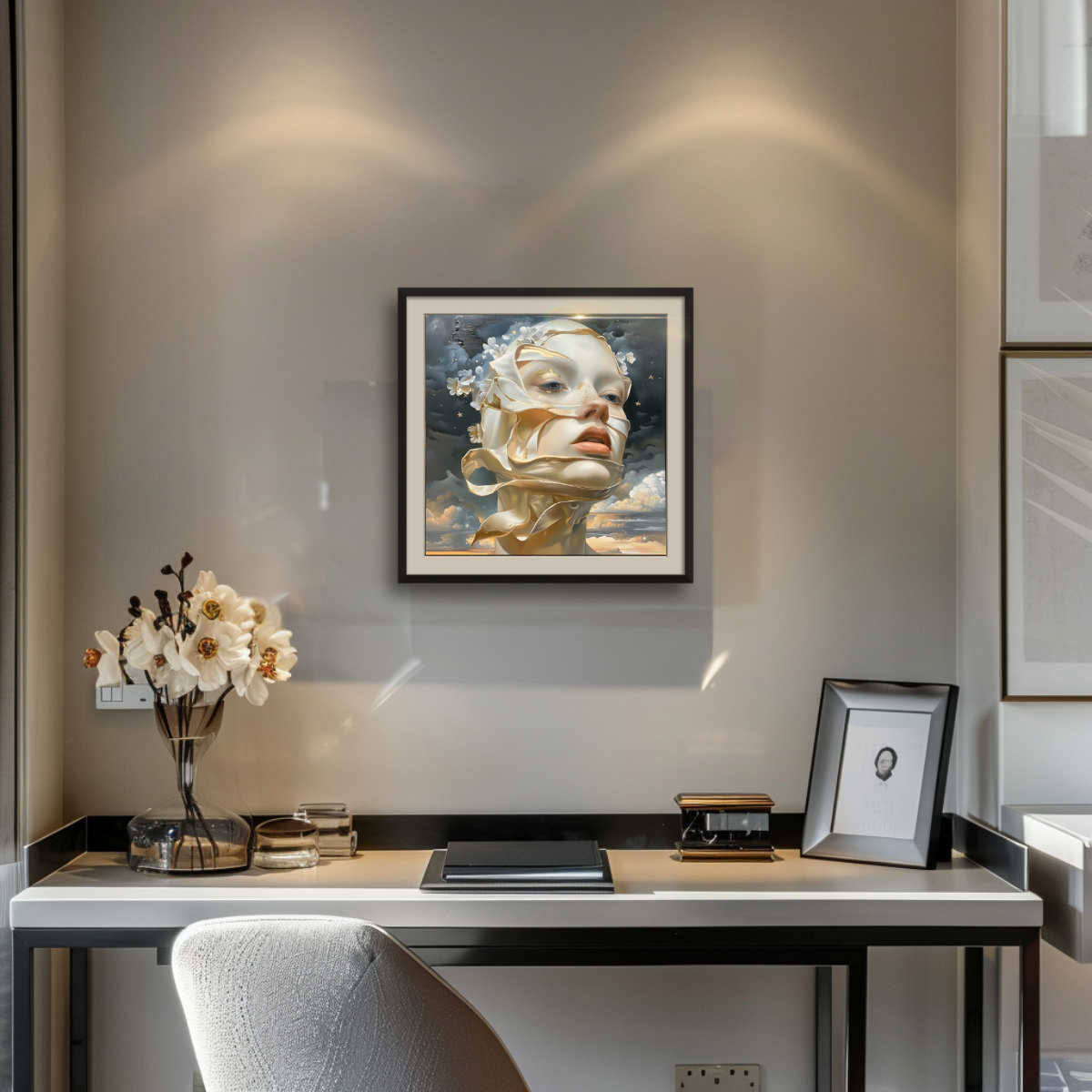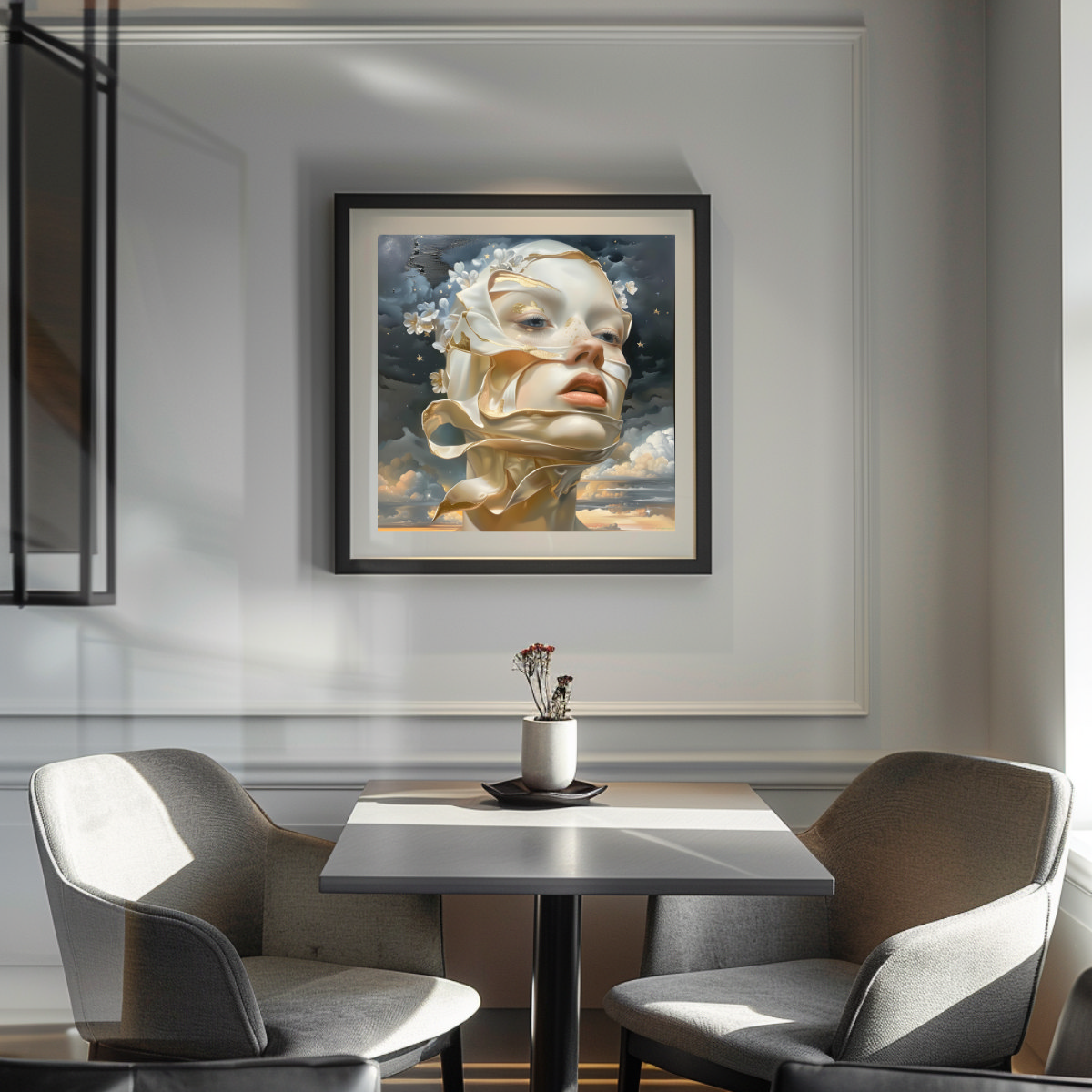 This artwork features the head of a girl rendered in a porcelain-like texture, with soft, delicate features. The pale, almost translucent hue of the porcelain contrasts gently with the subtle hints of blush and pastel tones, symbolizing the refined beauty and precision involved in plastic surgery. The serene expression and smooth complexion reflect the ideals of aesthetic perfection and the artistry involved in cosmetic enhancements.