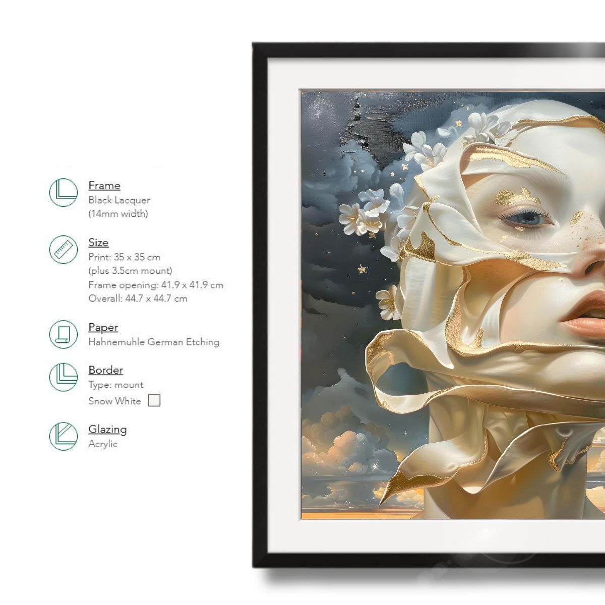 Paper: Hahnemuhle German Etching. Matt / 310gsm. A heavy-duty paper with a more textured finish than Photorag, a velvety matt surface, and a warm white hue with traits of a traditional artist board — reproduces painterly images, lithographs, and pastels superbly.