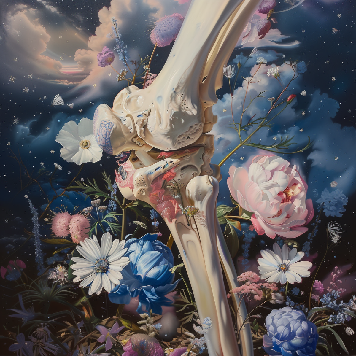This artwork features a fantastical interpretation of a joint adorned with floral motifs. The vibrant colors and intricate details blend the anatomical structure with the natural beauty of flowers, symbolizing both strength and delicateness in orthopedic surgery. The abstract forms and bright hues reflect the healing journey and the harmony between human anatomy and nature.
