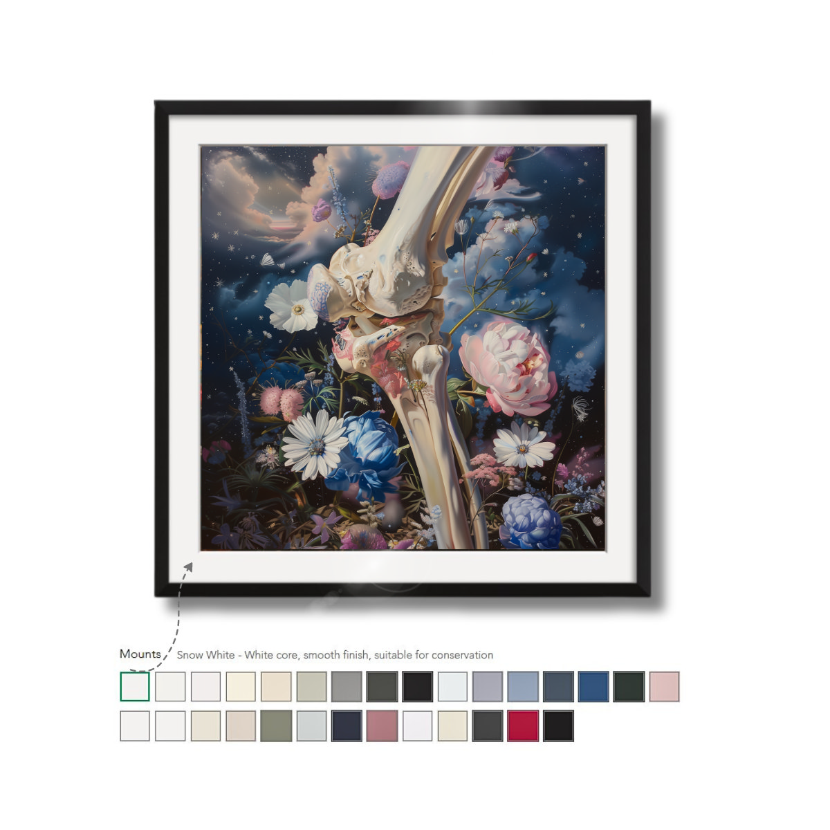 Our white core, black core, and conservation mounts are available in a wide selection of colors. They won’t discolor over time and are cut to size to fit your print and frame. Mounts help to lead the eye into the image and create added depth to your framed print.