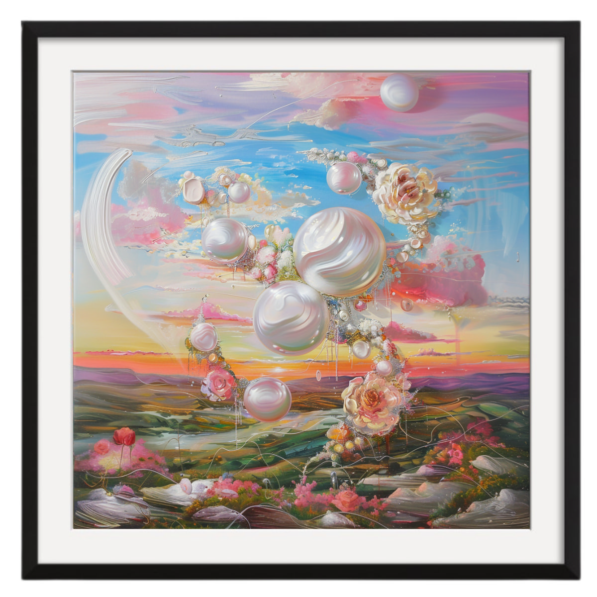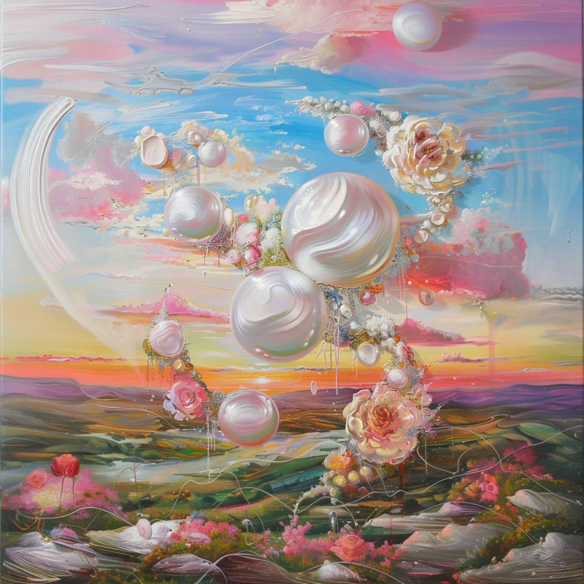 This painting highlights the elegance and beauty of a pearlescent object, symbolizing dental pearls, set in a fantastical arrangement of flowers. The object’s smooth, reflective surface plays with light, surrounded by delicate flowers in shades of pink, white, and green. The composition emphasizes the preciousness and care associated with dental health, reflecting the brilliance and purity of a healthy smile.