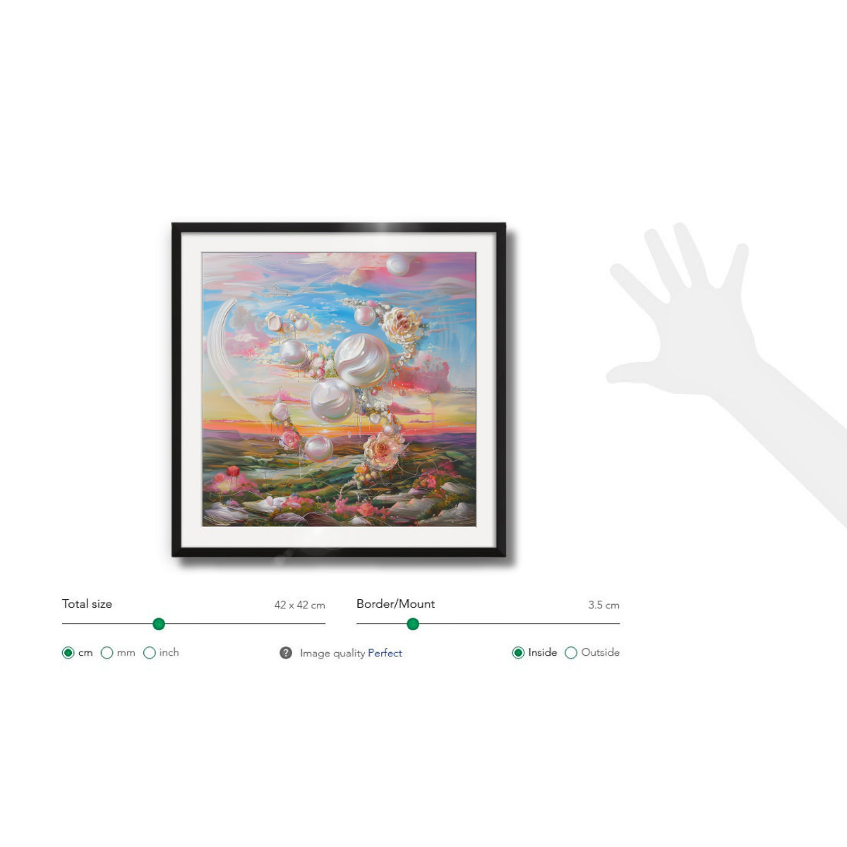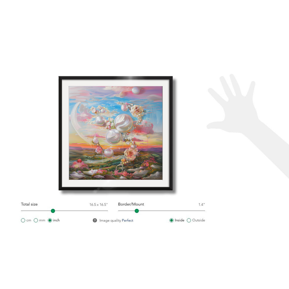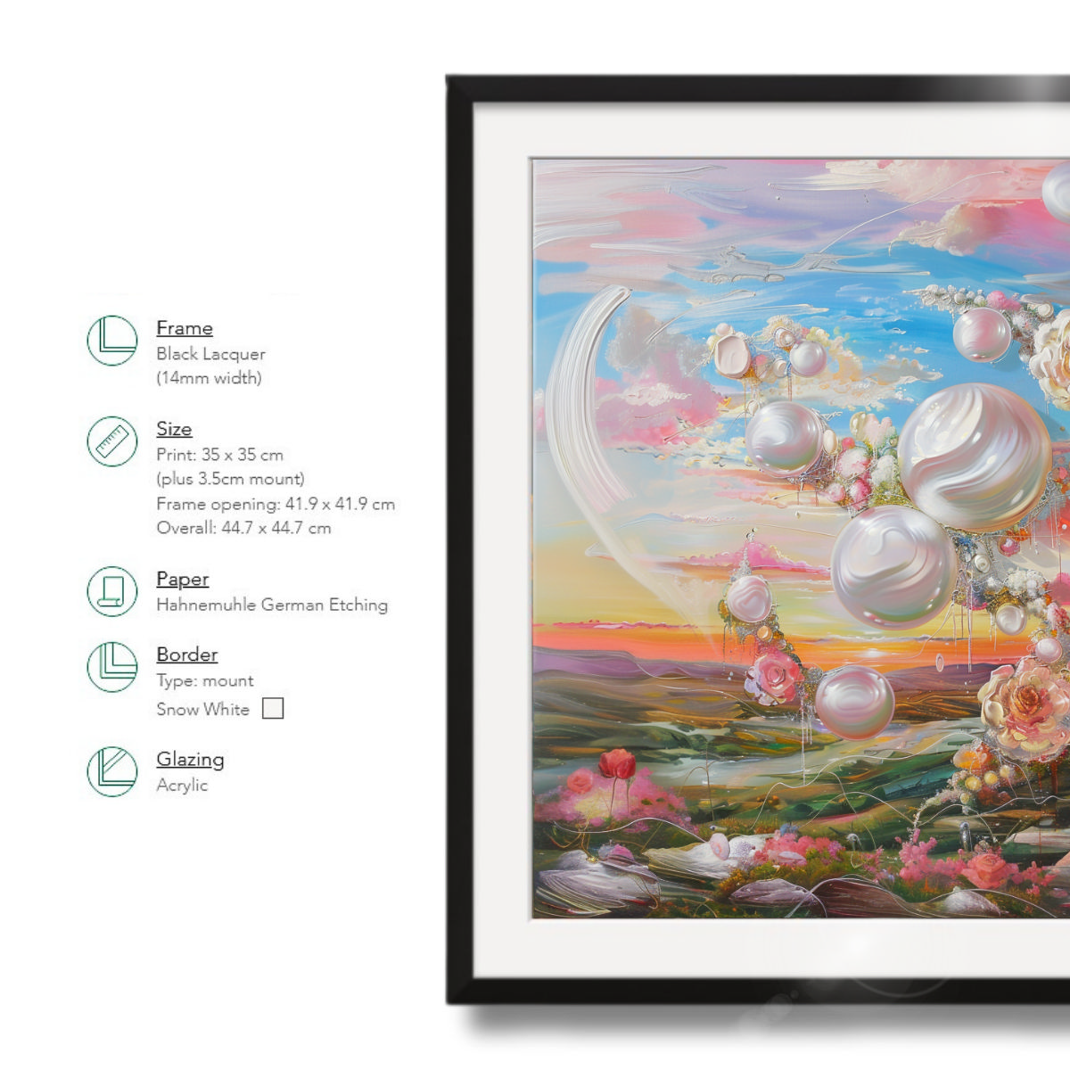 Frame of the painting: Black Lacquer, 14mm width, 13mm depth. However, you can choose another frame color: Dark Wood, White, Light Wood, Metallic.