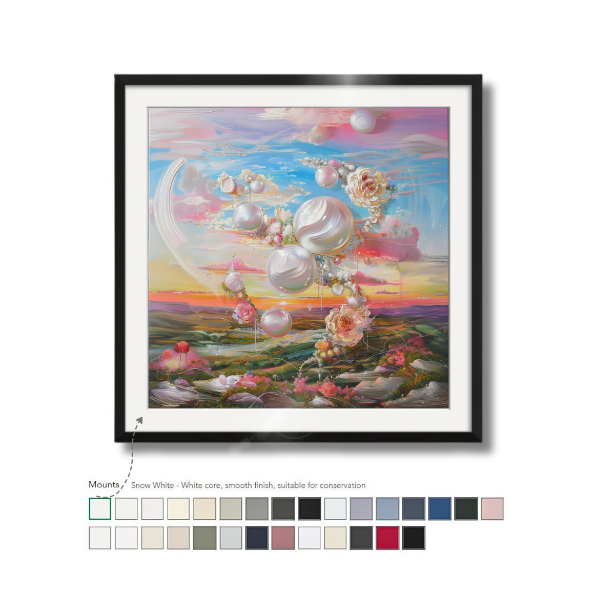 Our white core, black core, and conservation mounts are available in a wide selection of colors. They won’t discolor over time and are cut to size to fit your print and frame. Mounts help to lead the eye into the image and create added depth to your framed print.