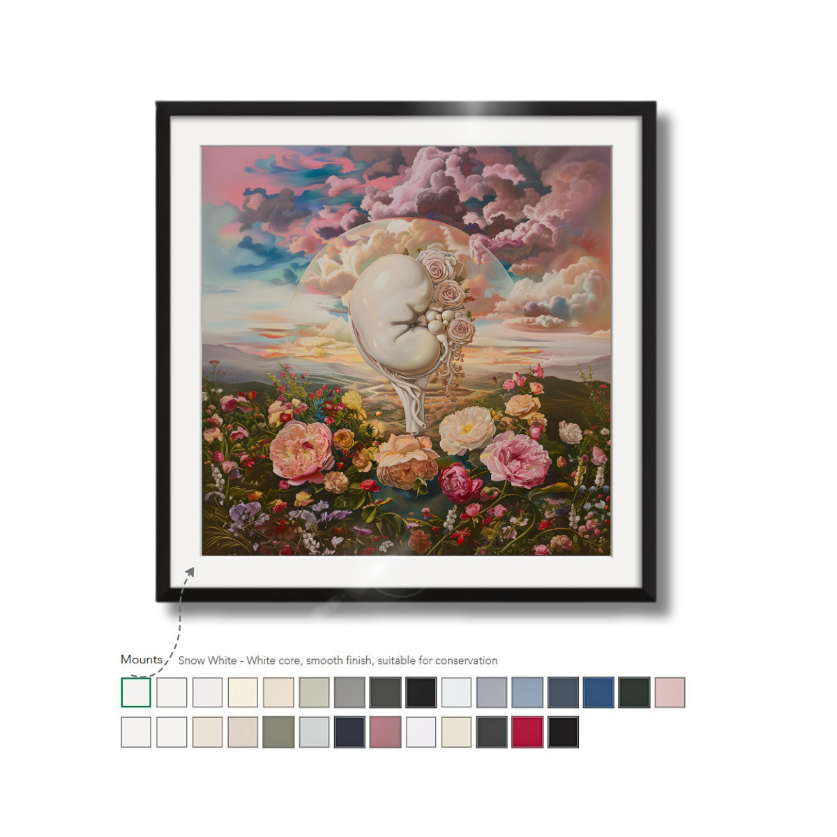 Our white core, black core, and conservation mounts are available in a wide selection of colors. They won’t discolor over time and are cut to size to fit your print and frame. Mounts help to lead the eye into the image and create added depth to your framed print.