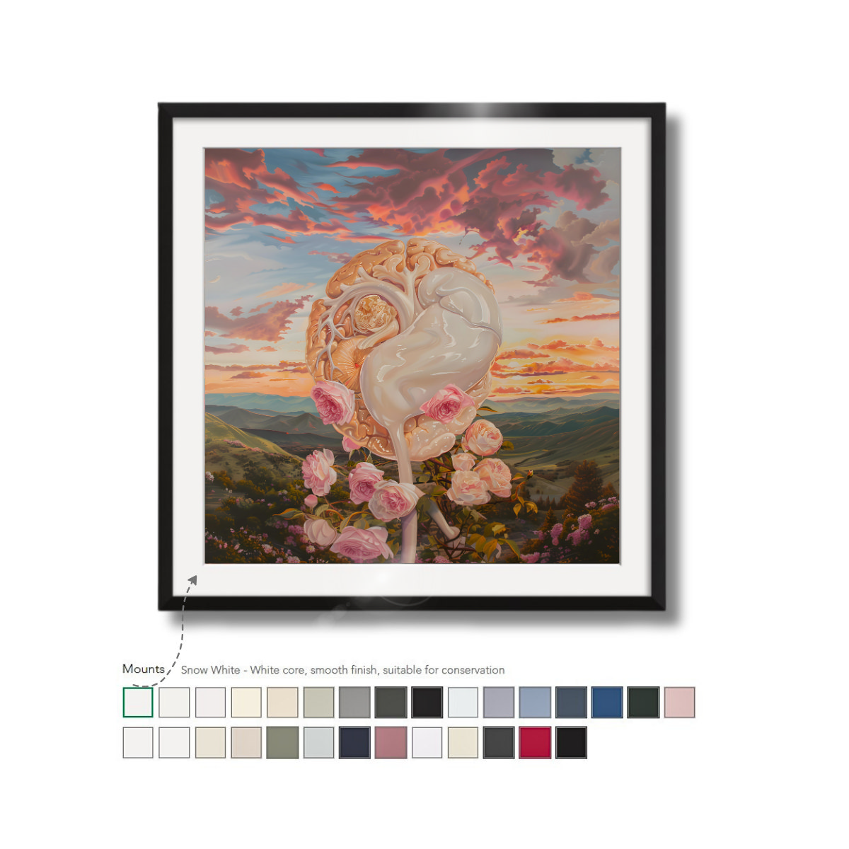 Our white core, black core, and conservation mounts are available in a wide selection of colors. They won’t discolor over time and are cut to size to fit your print and frame. Mounts help to lead the eye into the image and create added depth to your framed print.