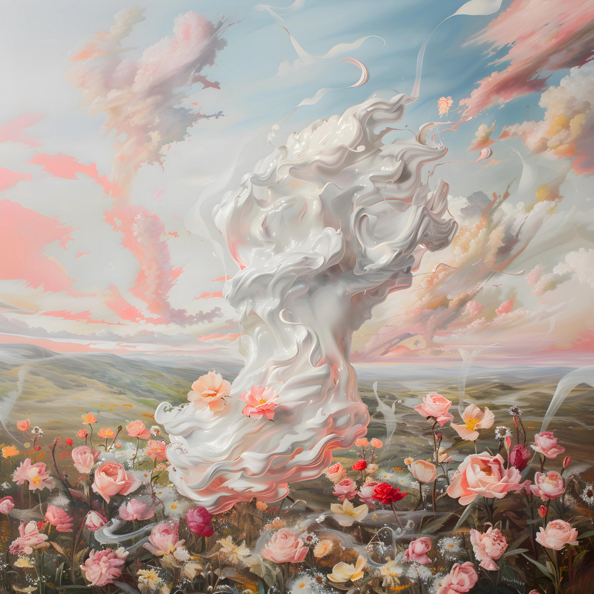 This piece presents a surreal, porcelain-like head amidst a flowing abstract form. The ethereal whites and subtle blues create a calming and airy atmosphere. The abstract, flowing design symbolizes the fluid nature of thoughts and the continual evolution of the human psyche. It captures the essence of emotional and psychological exploration, reflecting the dynamic and supportive journey within psychiatric practice.