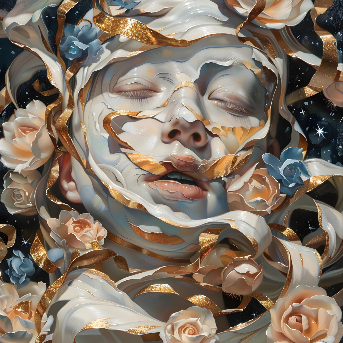 This painting presents an abstract representation of a girl's head, symbolizing balance and elegance. The use of harmonious curves and a muted color palette of whites and soft ivories convey a sense of natural beauty enhanced through skilled artistry. The artwork aims to reflect the intricate process of achieving aesthetic harmony, blending realistic features with abstract elements to highlight the fusion of art and medical science in plastic surgery.