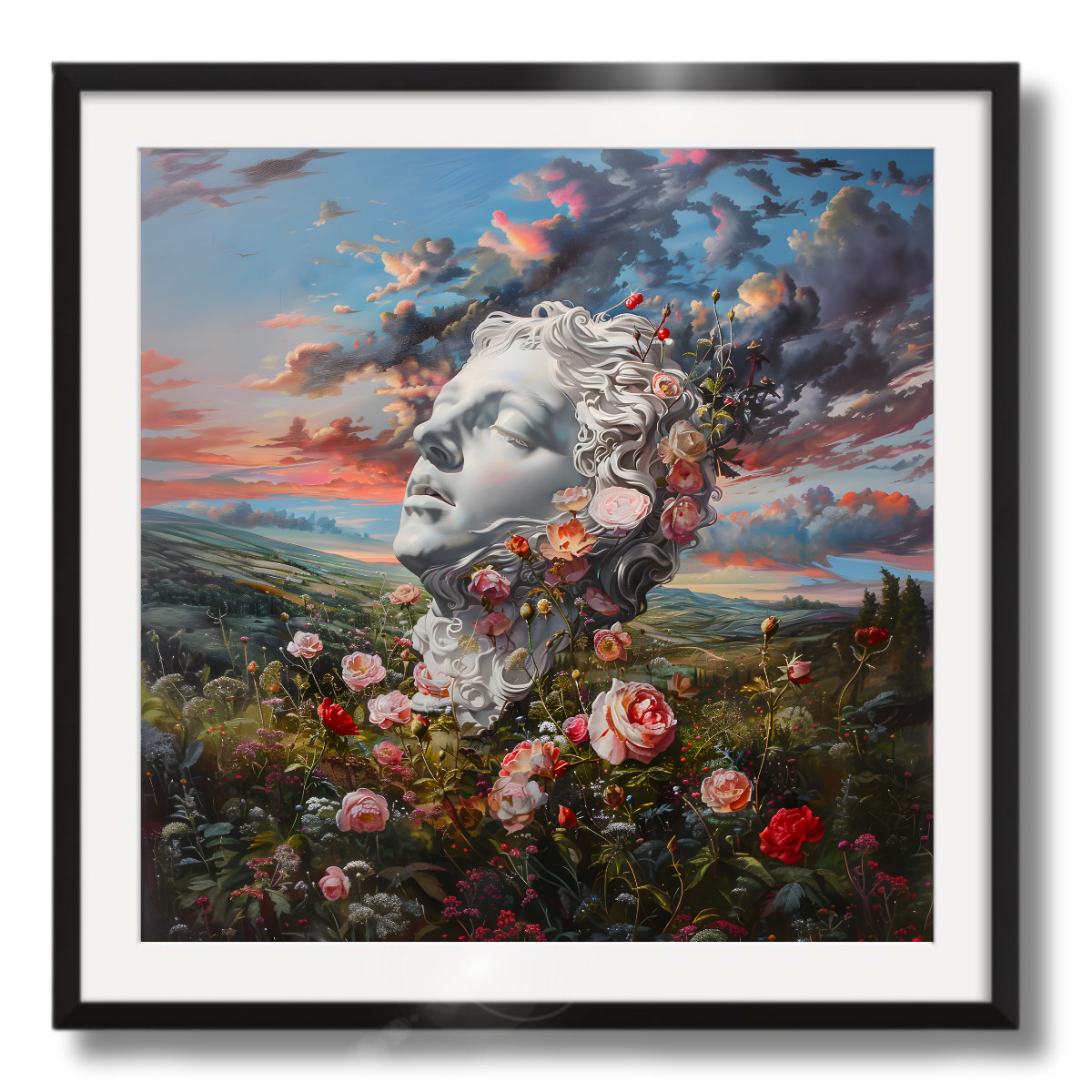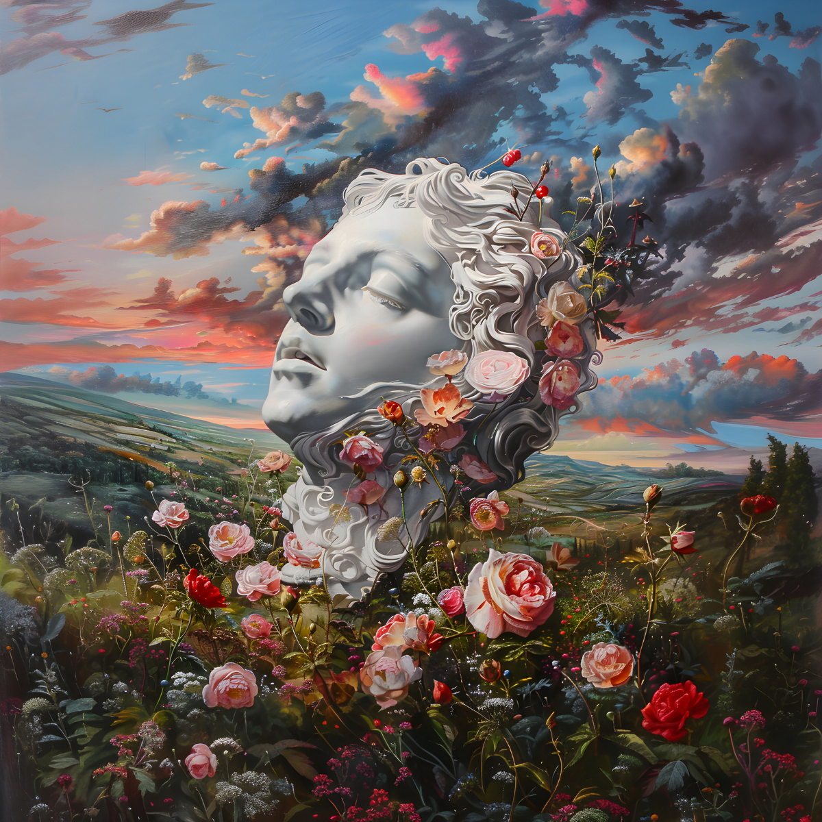 This artwork depicts a calm, porcelain head of a young man set within a blooming floral arrangement. The soothing palette of greens and pastels highlights the peaceful and contemplative nature of the piece. The flowers represent growth and the rejuvenation of mental health, emphasizing the restorative power of nature and therapeutic environments in psychiatric care.