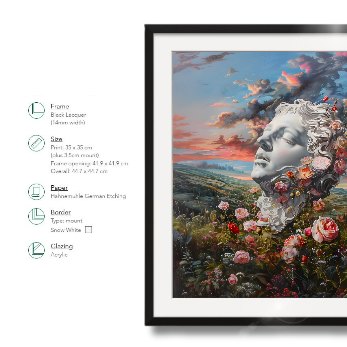 Paper: Hahnemuhle German Etching. Matt / 310gsm. A heavy-duty paper with a more textured finish than Photorag, a velvety matt surface, and a warm white hue with traits of a traditional artist board — reproduces painterly images, lithographs, and pastels superbly.