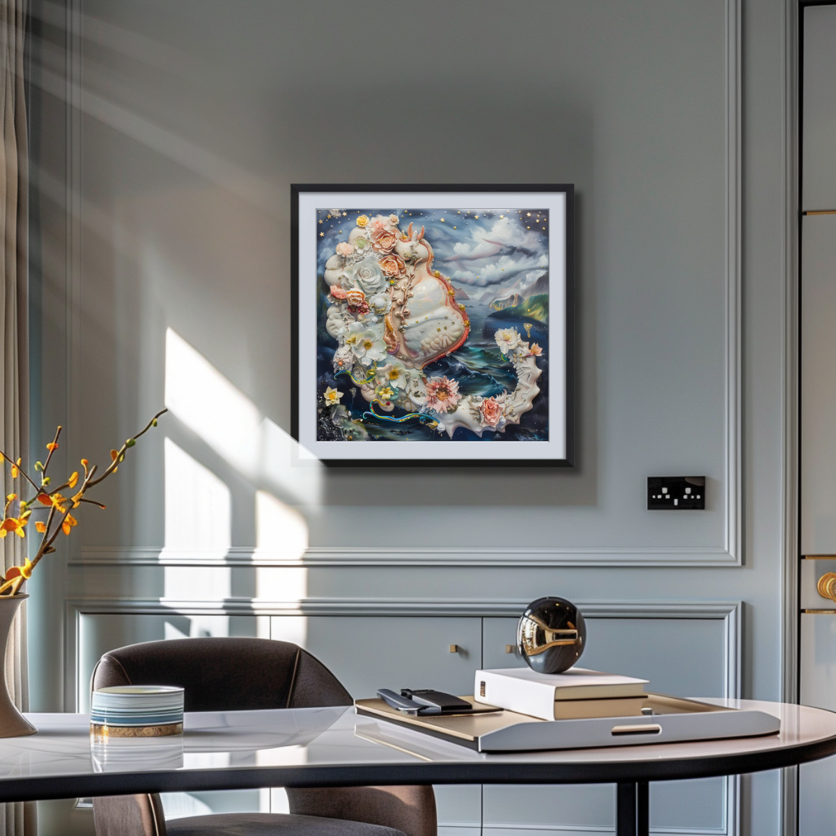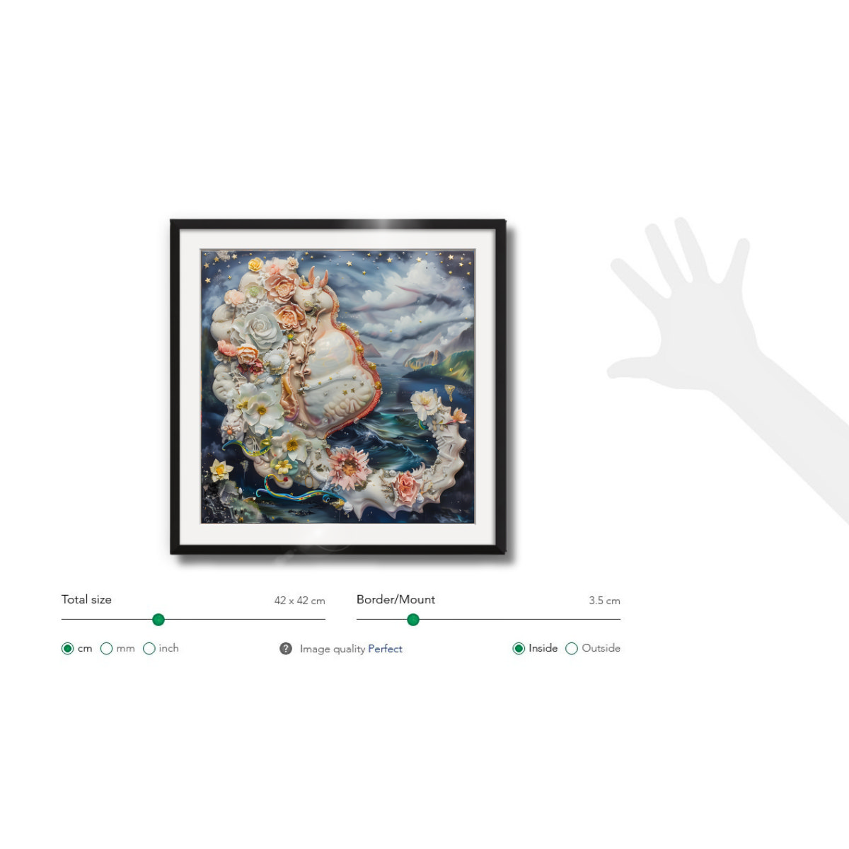 Frame of the painting: Black Lacquer, 14mm width, 13mm depth. However, you can choose another frame color: Dark Wood, White, Light Wood, Metallic.