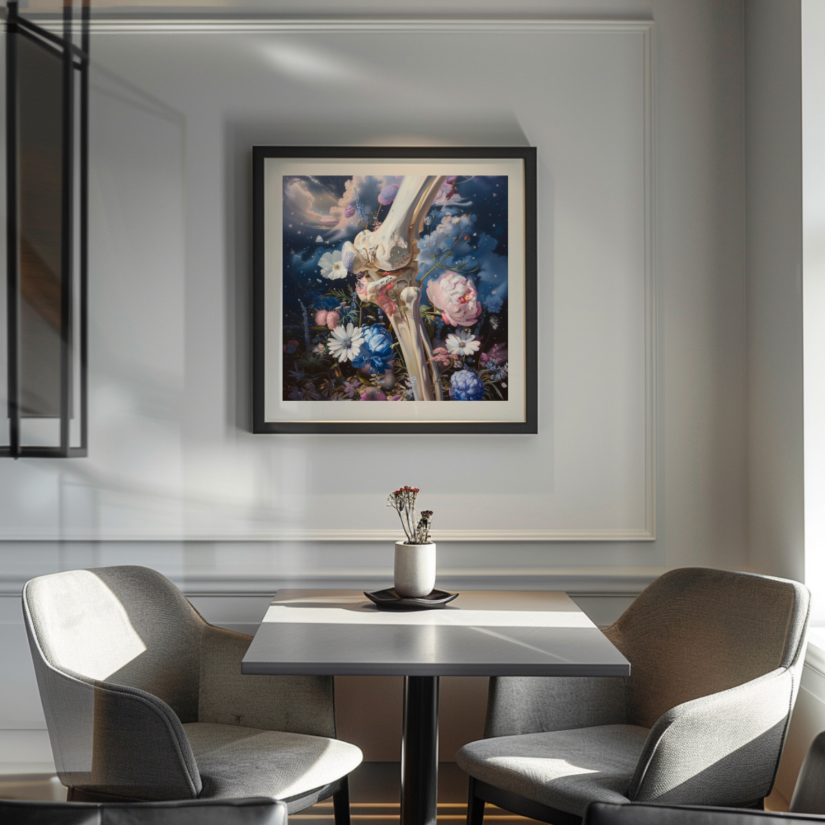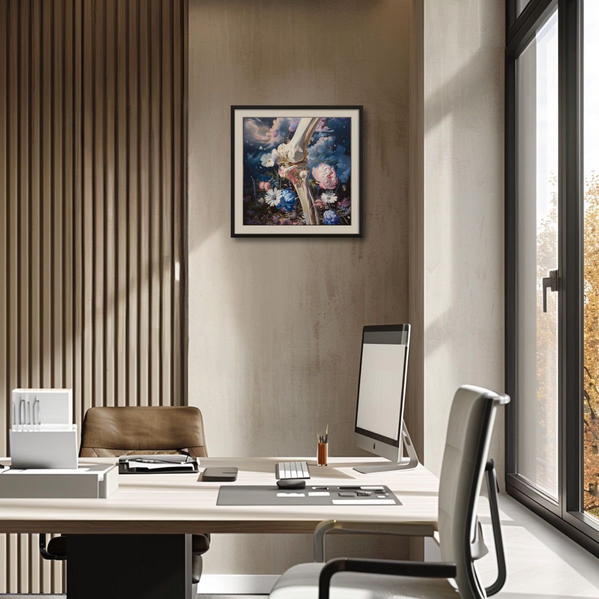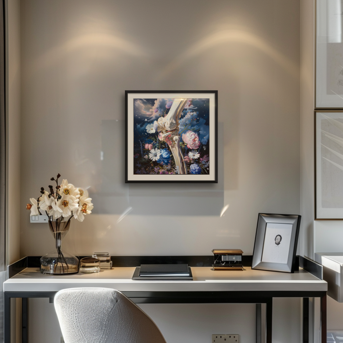 In this artwork, a joint is depicted with elaborate floral motifs, merging medical precision with artistic imagination. The use of gentle curves and bright, floral patterns signifies the beauty and complexity of orthopedic structures. The abstract, flowing forms celebrate the interconnection between human anatomy and the elegance of nature, illustrating a vision of harmony and healing.