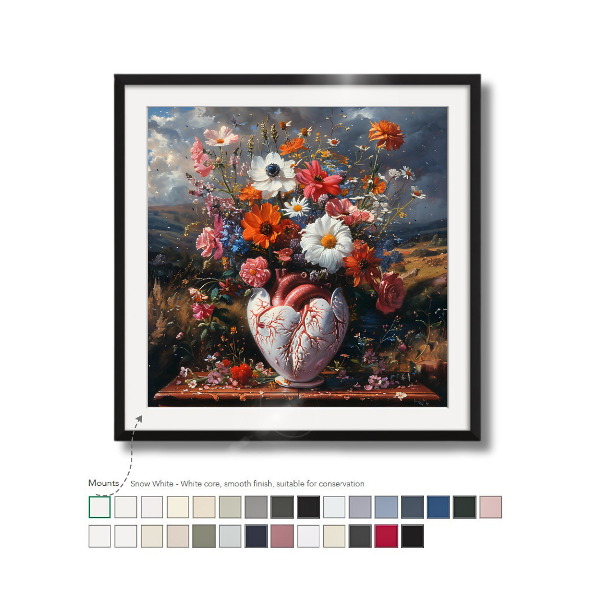 Our white core, black core, and conservation mounts are available in a wide selection of colors. They won’t discolor over time and are cut to size to fit your print and frame. Mounts help to lead the eye into the image and create added depth to your framed print.