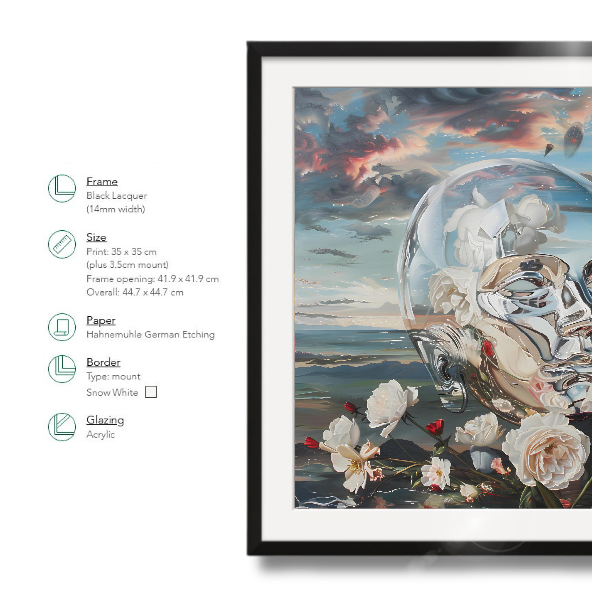 Paper: Hahnemuhle German Etching. Matt / 310gsm. A heavy-duty paper with a more textured finish than Photorag, a velvety matt surface, and a warm white hue with traits of a traditional artist board — reproduces painterly images, lithographs, and pastels superbly.