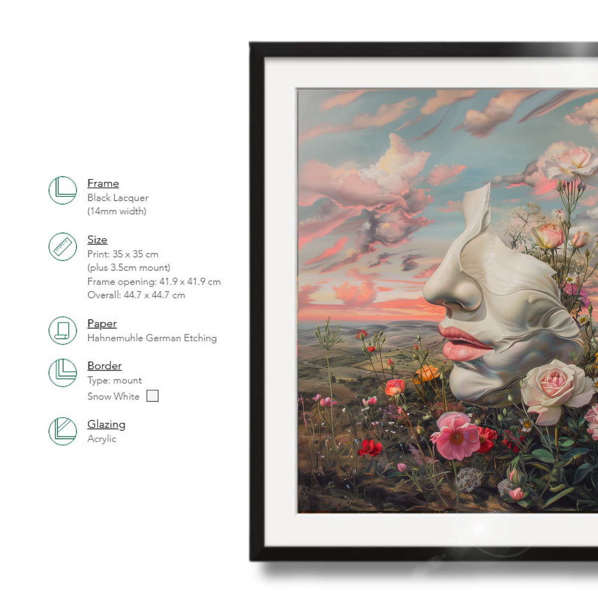 Paper: Hahnemuhle German Etching. Matt / 310gsm. A heavy-duty paper with a more textured finish than Photorag, a velvety matt surface, and a warm white hue with traits of a traditional artist board — reproduces painterly images, lithographs, and pastels superbly.