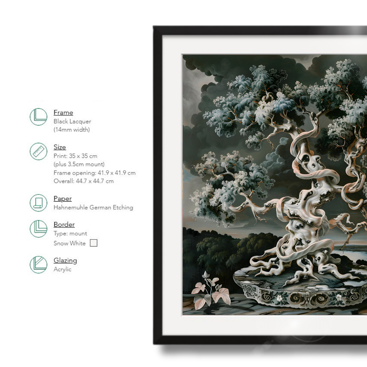 Paper: Hahnemuhle German Etching. Matt / 310gsm. A heavy-duty paper with a more textured finish than Photorag, a velvety matt surface, and a warm white hue with traits of a traditional artist board — reproduces painterly images, lithographs, and pastels superbly.
