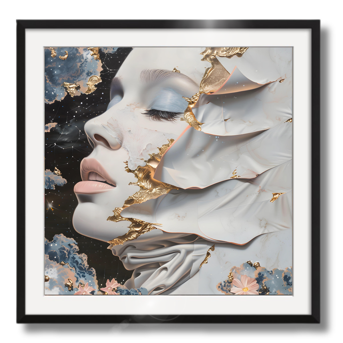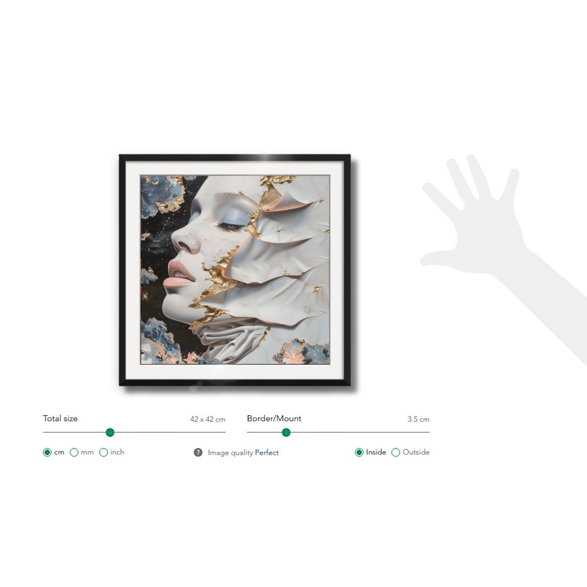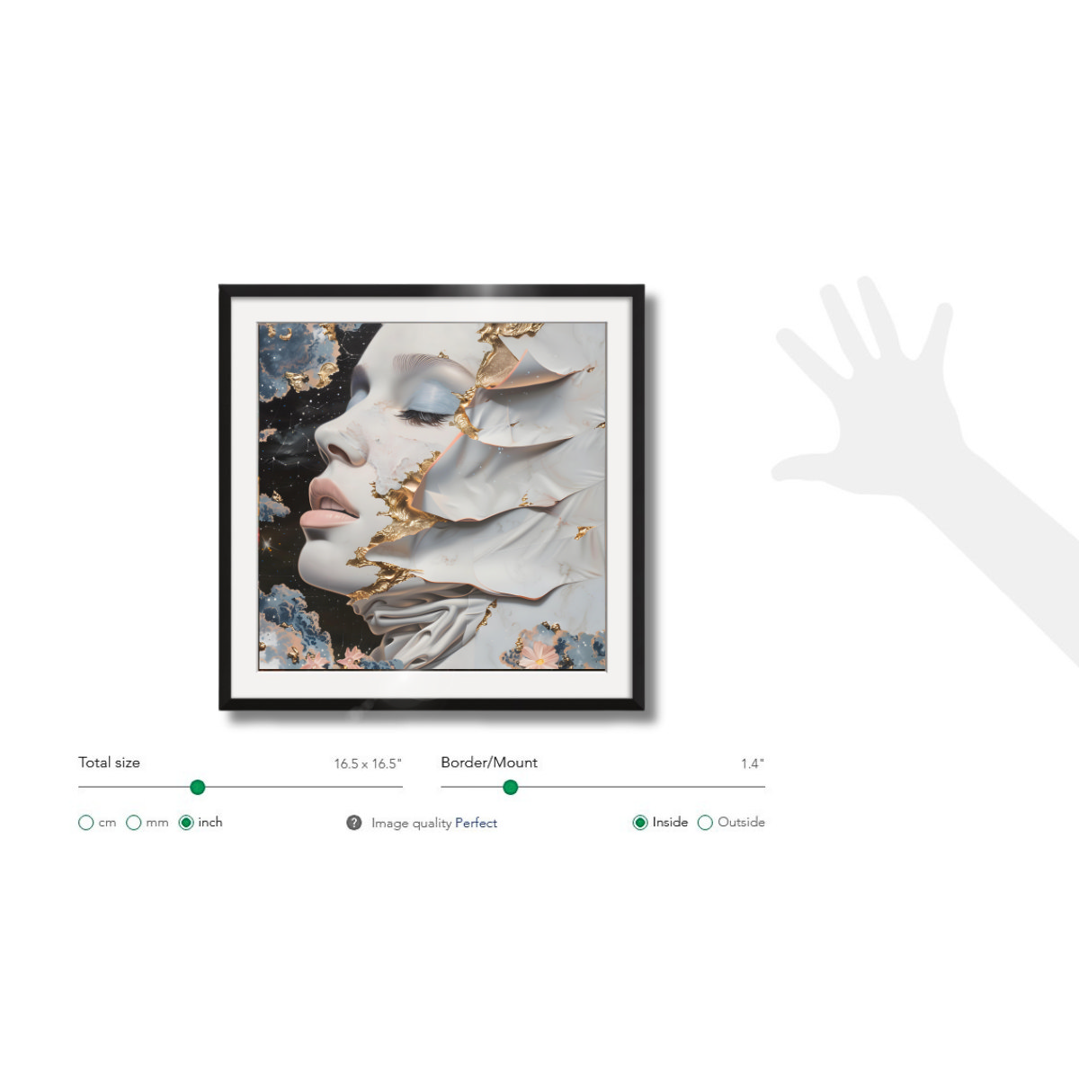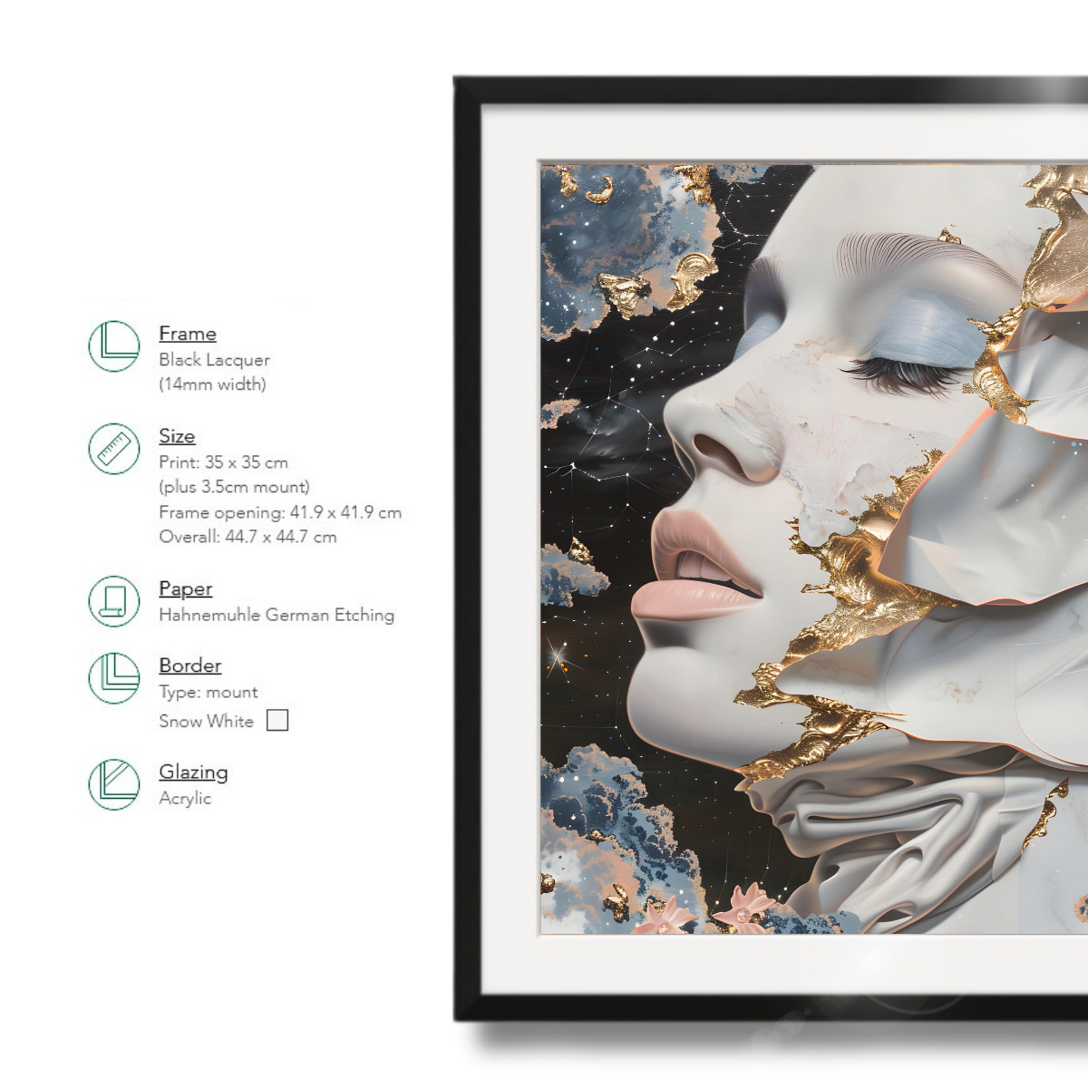 Frame of the painting: Black Lacquer, 14mm width, 13mm depth. However, you can choose another frame color: Dark Wood, White, Light Wood, Metallic.