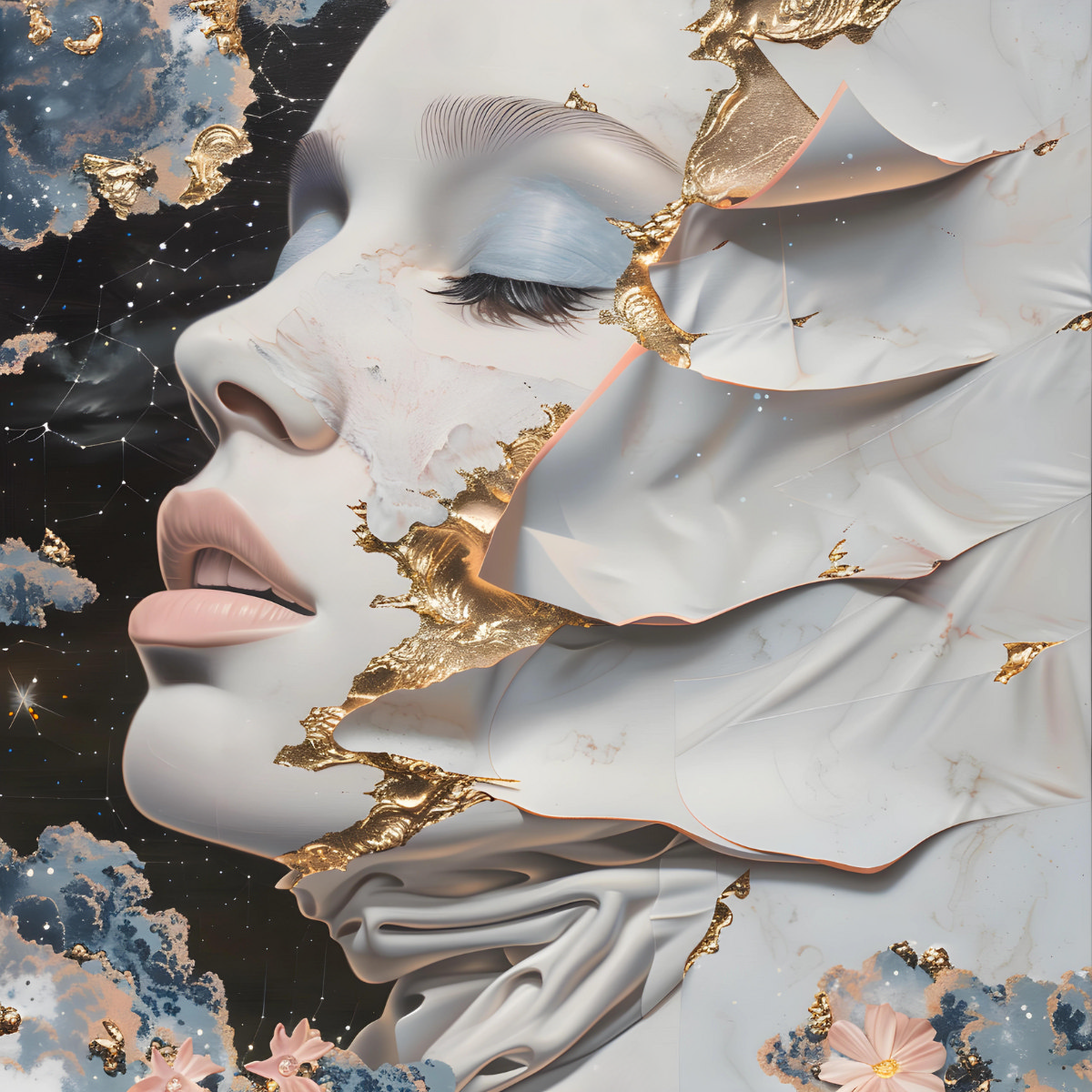 This artwork focuses on the head of a girl, emphasizing symmetrical beauty with soft pastel colors. The intricate details of her features, highlighted by light pinks and blues, represent the precision and care involved in plastic surgery. The overall composition exudes calmness and serenity, reflecting the gentle and effective transformation achieved through cosmetic enhancements.
