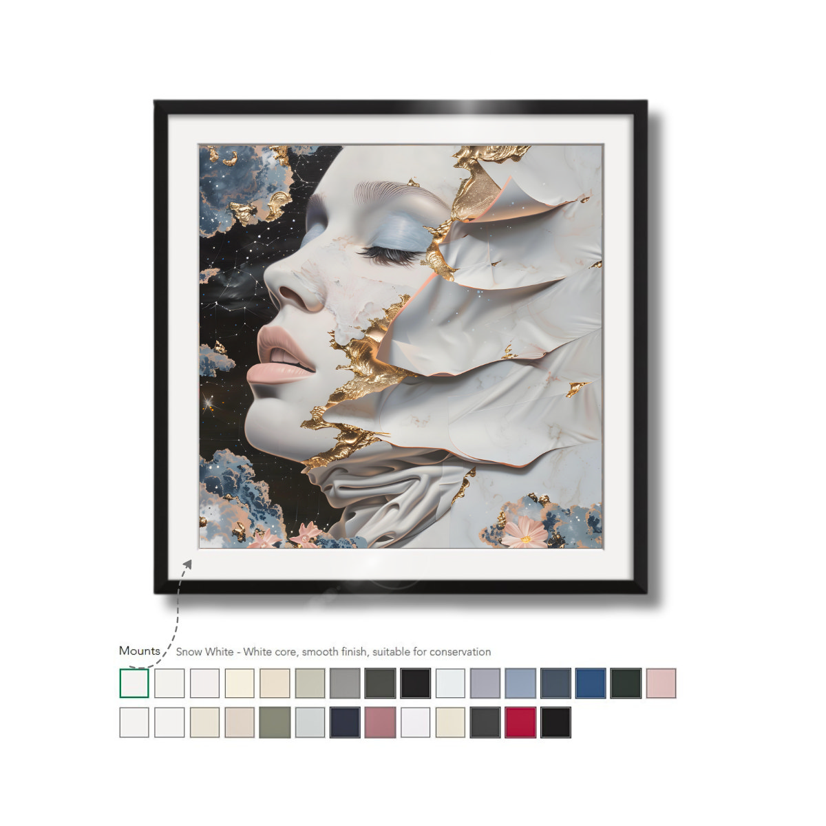 Our white core, black core, and conservation mounts are available in a wide selection of colors. They won’t discolor over time and are cut to size to fit your print and frame. Mounts help to lead the eye into the image and create added depth to your framed print.