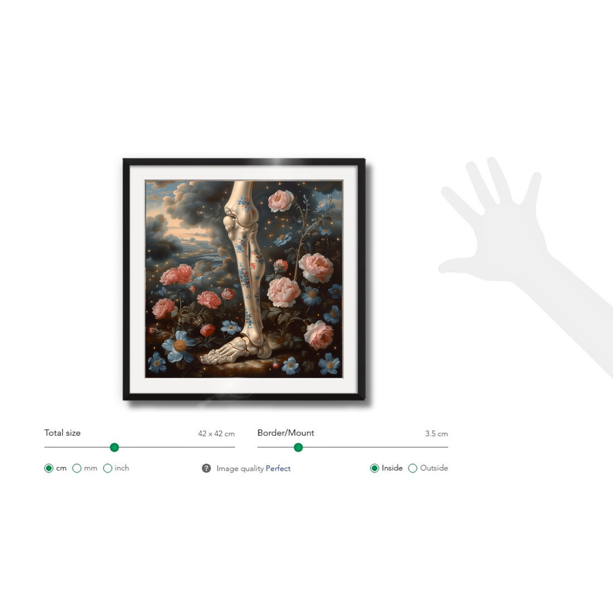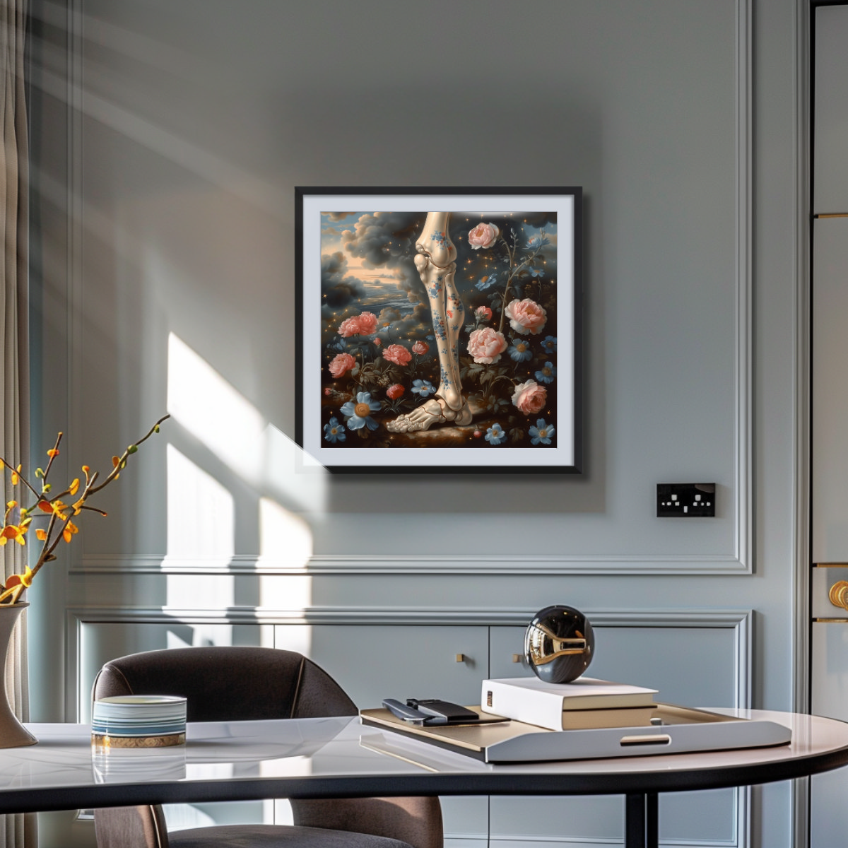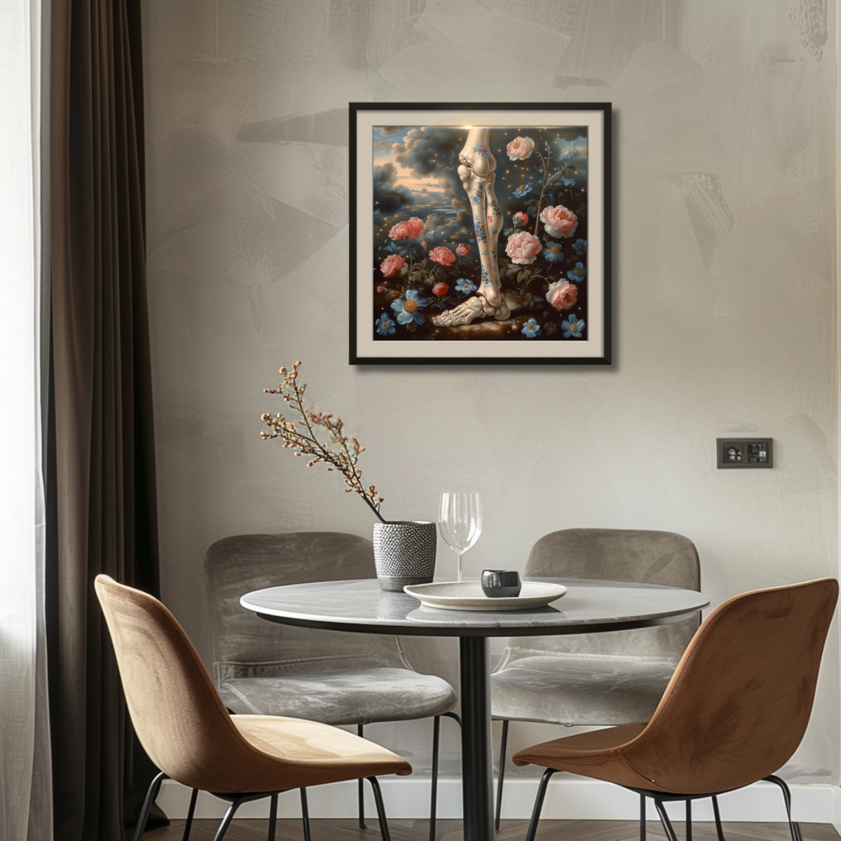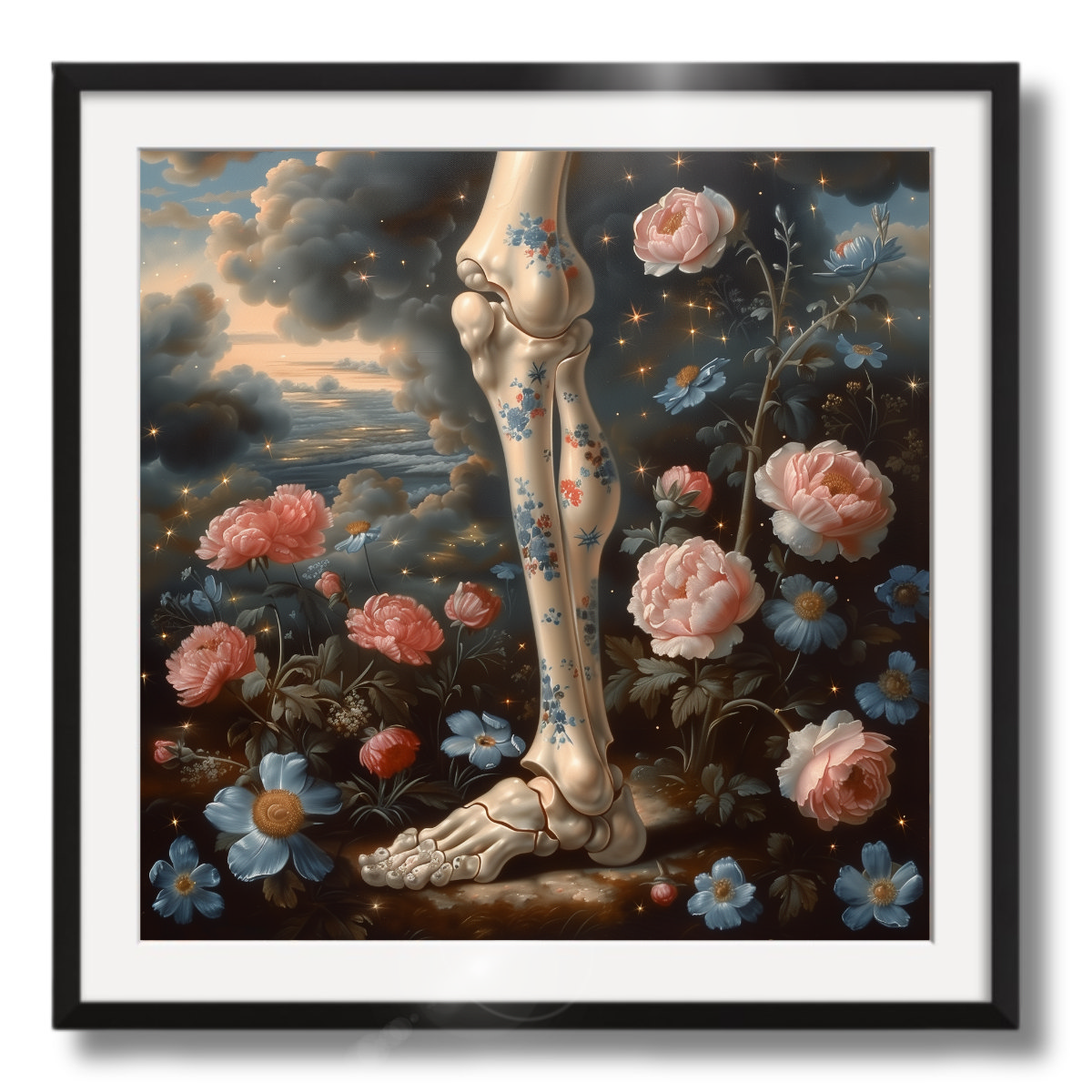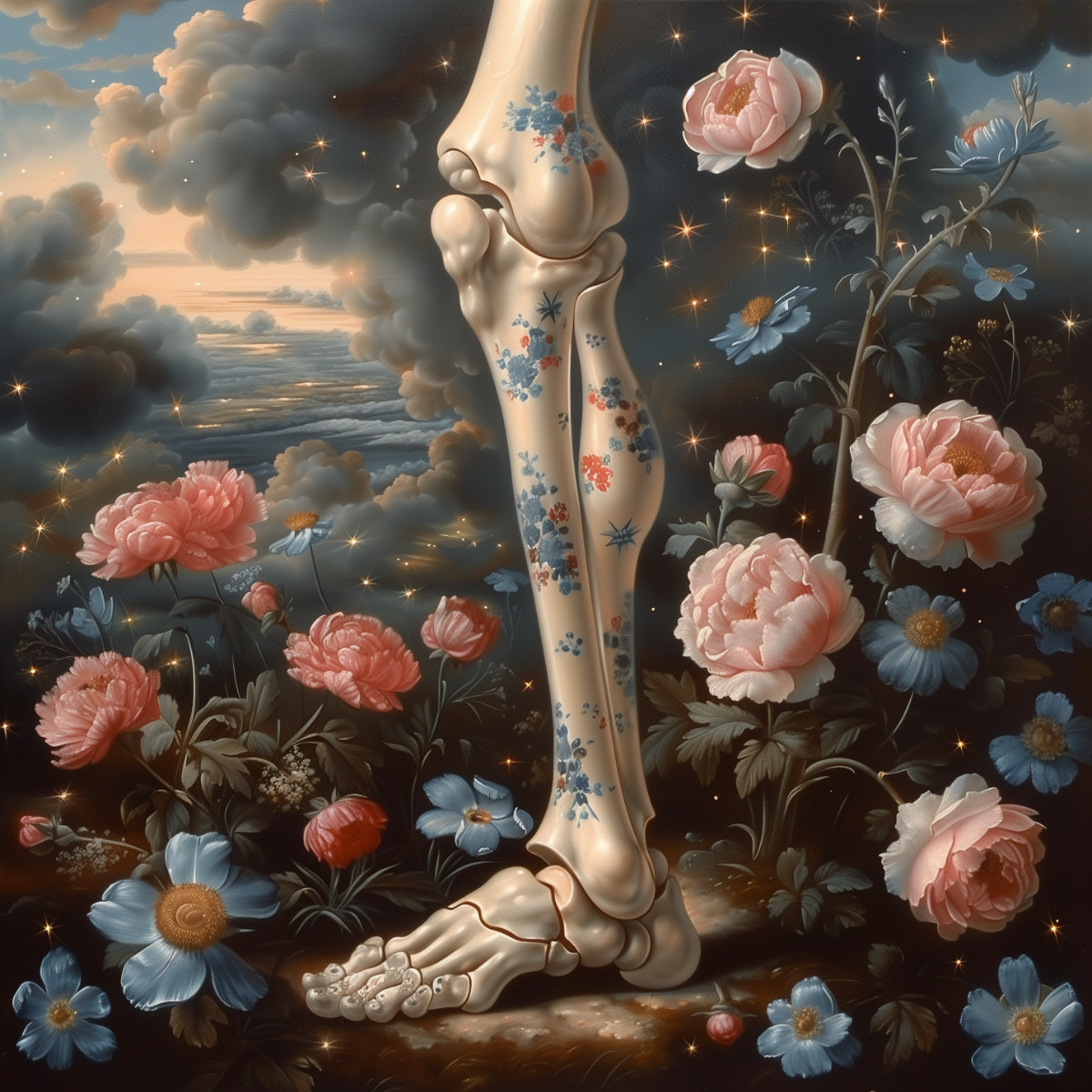This piece presents an imaginative view of leg bones intertwined with blooming flowers. The abstract composition and soft pastel colors aim to soften the starkness of bones, introducing an element of vitality and regeneration that is inherent in orthopedic healing. The fusion of anatomical and floral designs evokes a sense of rejuvenation and the organic process of recovery in orthopedics.