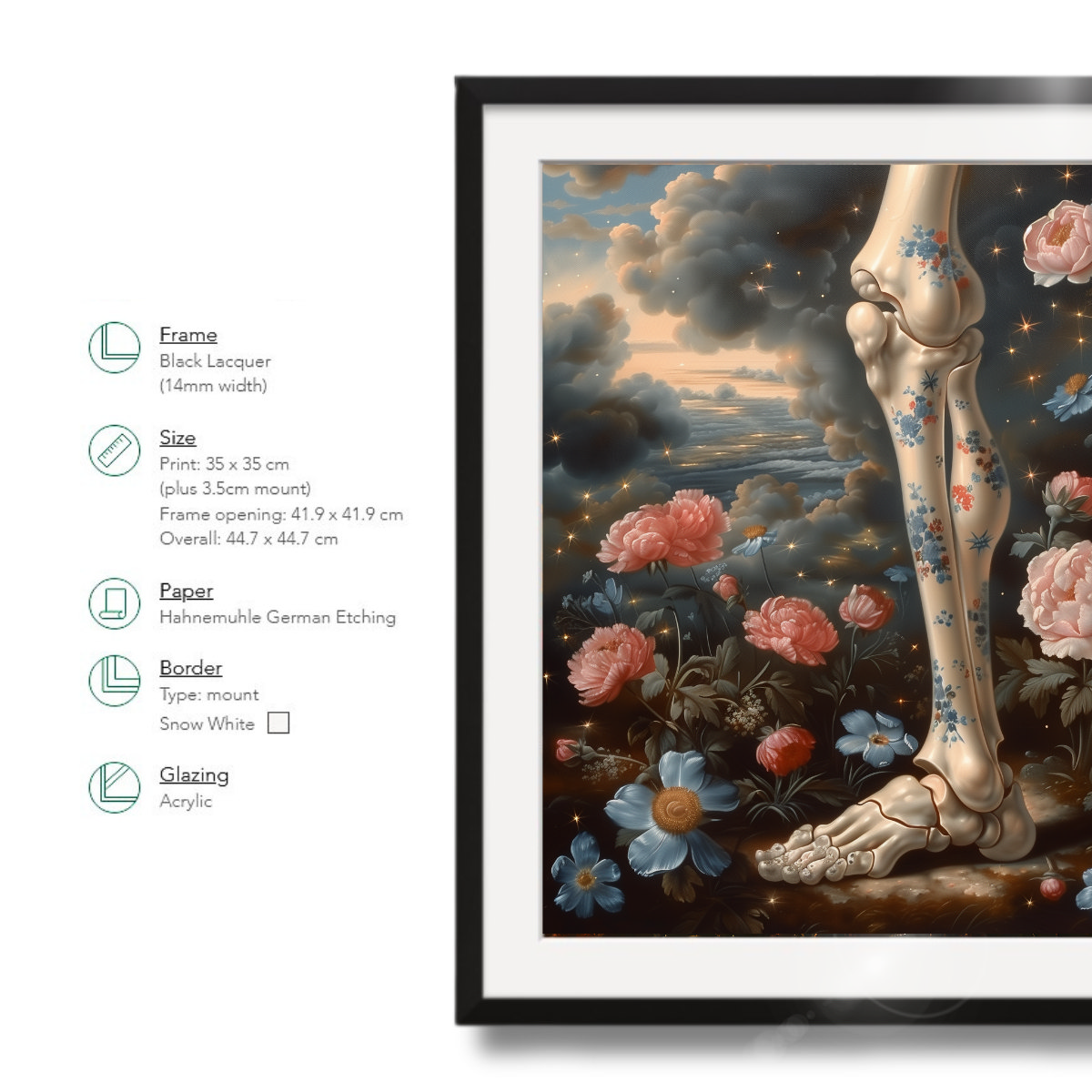 Frame of the painting: Black Lacquer, 14mm width, 13mm depth. However, you can choose another frame color: Dark Wood, White, Light Wood, Metallic.