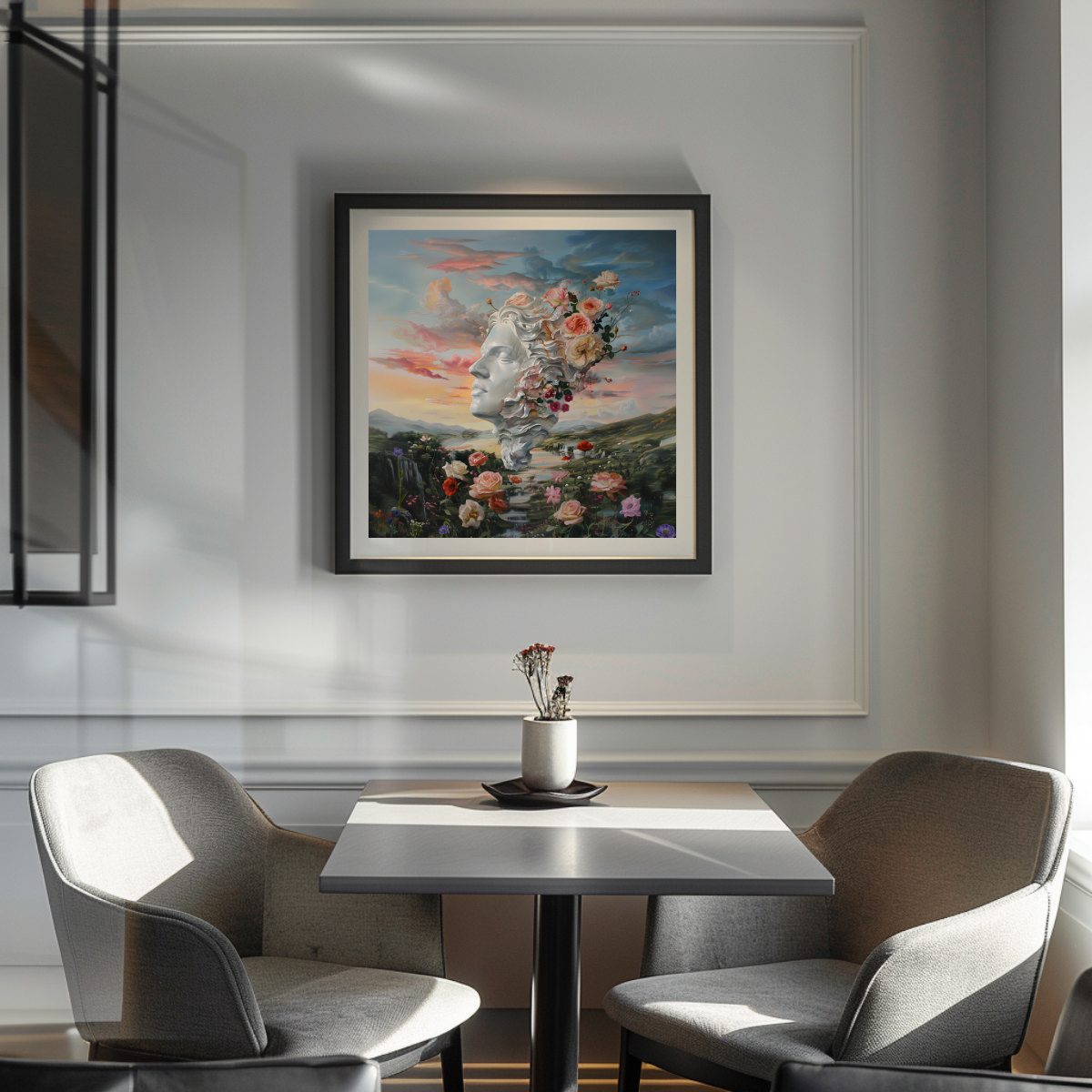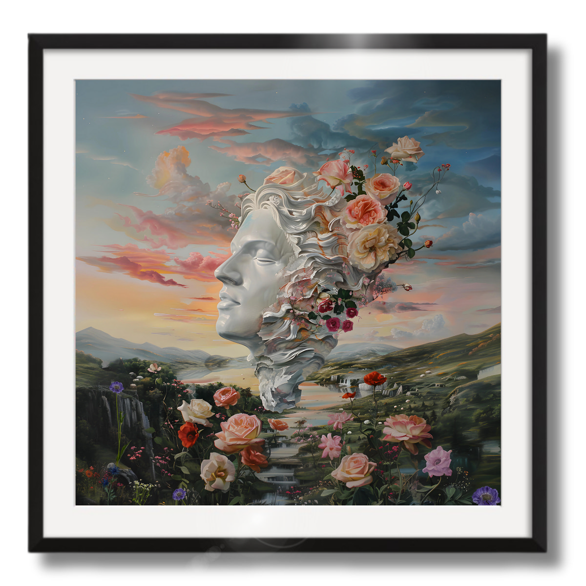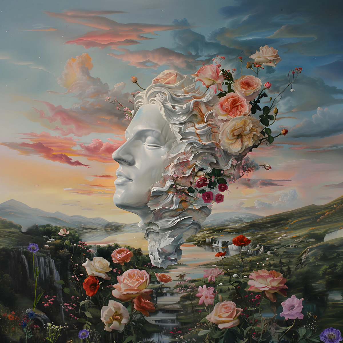 This painting showcases a serene, porcelain head of a young man enveloped by gentle flowers. The muted tones of blues and whites, blended with soft floral accents, convey tranquility and introspection. The floral surroundings symbolize the nurturing environment essential in psychiatric therapy, where calmness and healing are cultivated through gentle care and support.