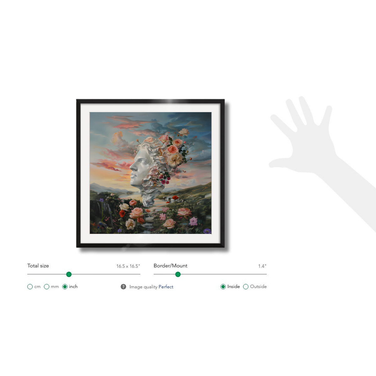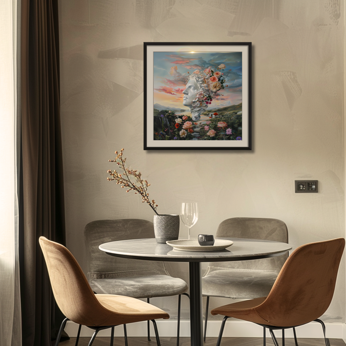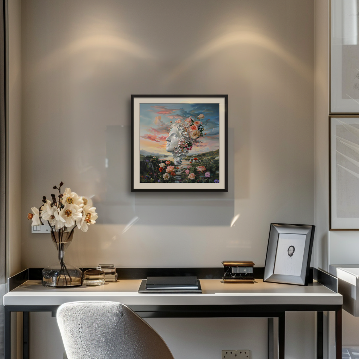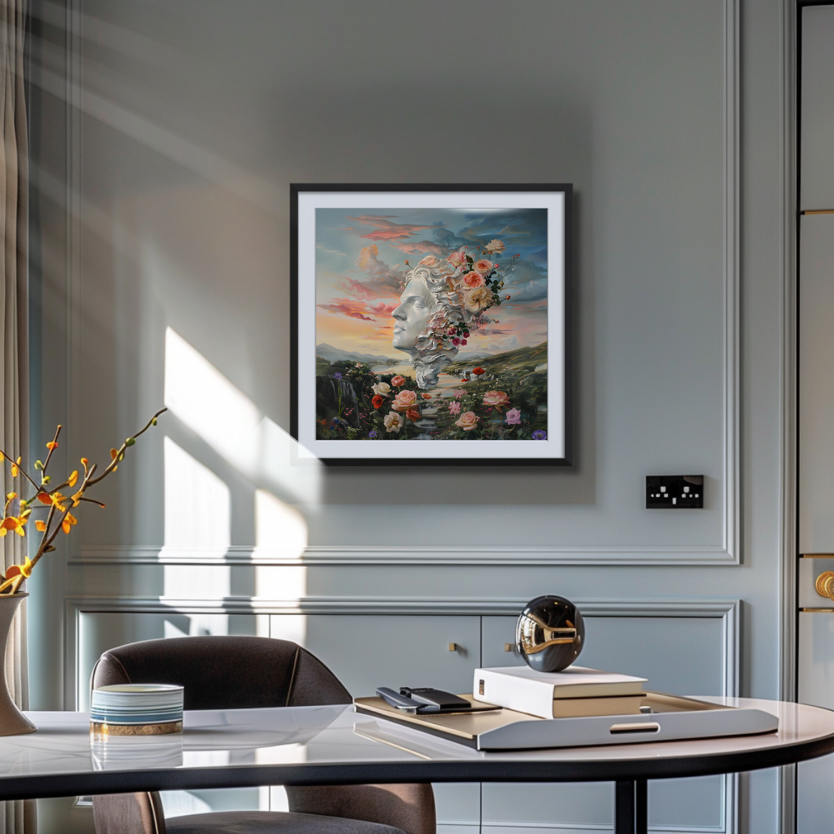 This painting showcases a serene, porcelain head of a young man enveloped by gentle flowers. The muted tones of blues and whites, blended with soft floral accents, convey tranquility and introspection. The floral surroundings symbolize the nurturing environment essential in psychiatric therapy, where calmness and healing are cultivated through gentle care and support.