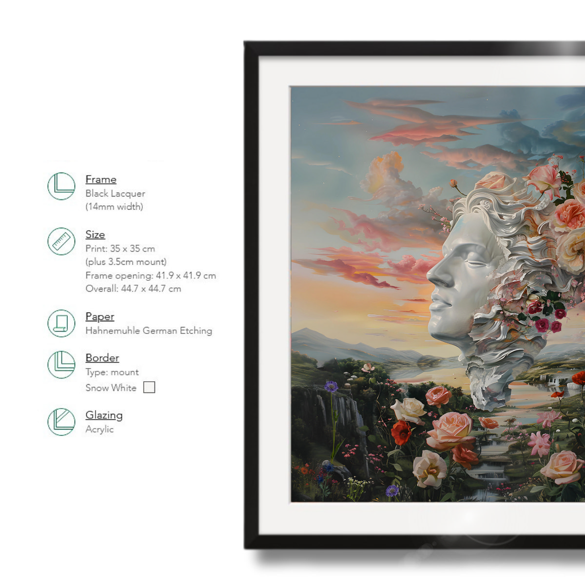 Paper: Hahnemuhle German Etching. Matt / 310gsm. A heavy-duty paper with a more textured finish than Photorag, a velvety matt surface, and a warm white hue with traits of a traditional artist board — reproduces painterly images, lithographs, and pastels superbly.