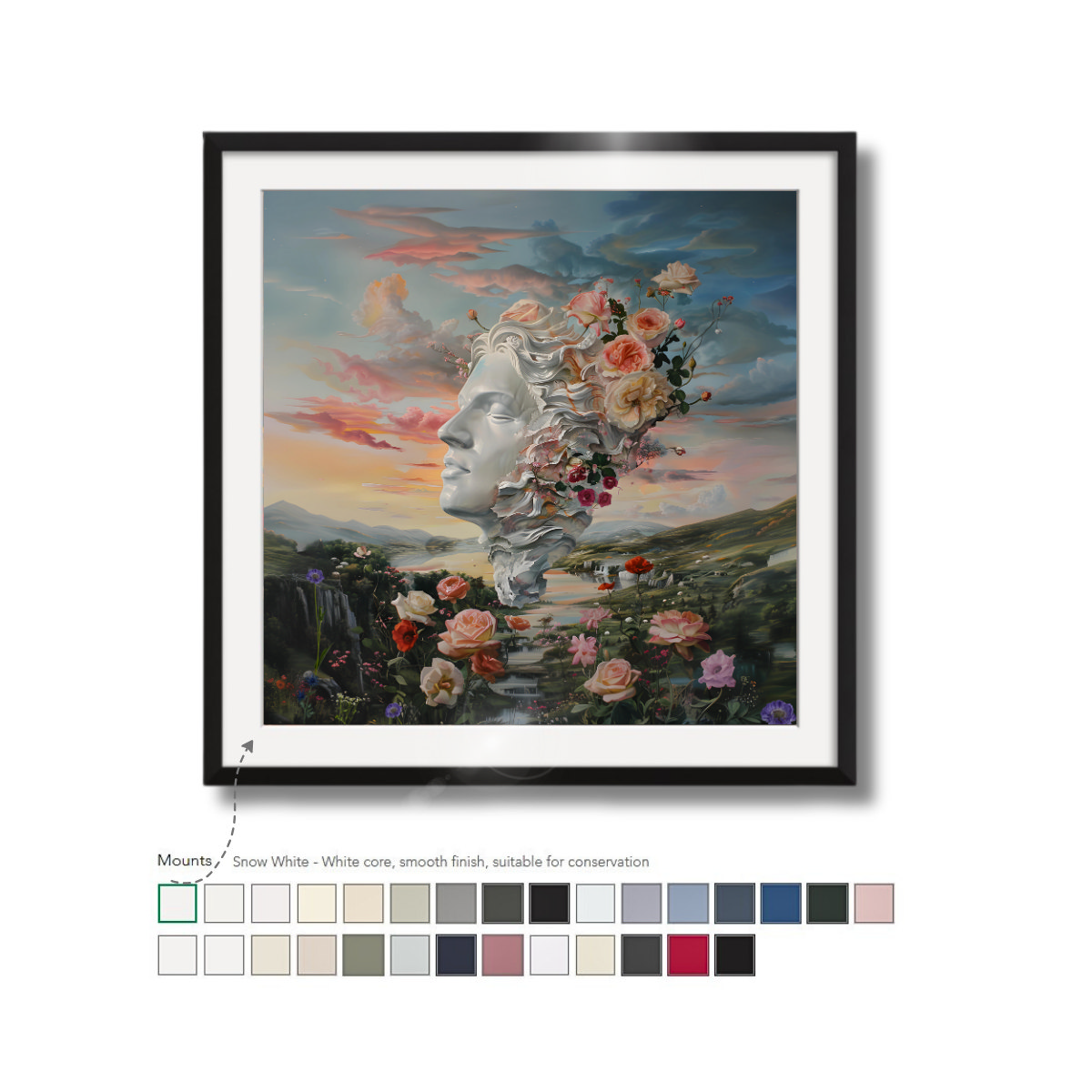 Our white core, black core, and conservation mounts are available in a wide selection of colors. They won’t discolor over time and are cut to size to fit your print and frame. Mounts help to lead the eye into the image and create added depth to your framed print.