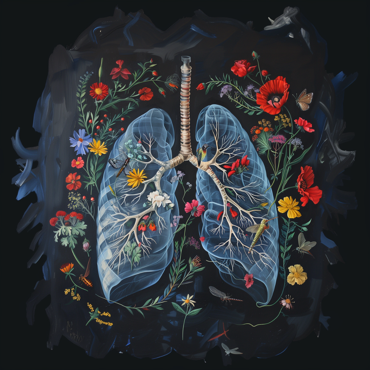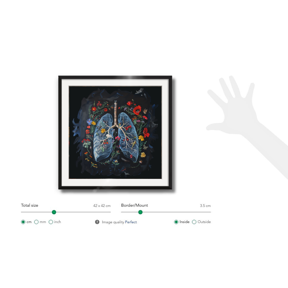 As an artist, I aimed to merge biological form with natural beauty in this piece. It features a fantastical rendition of human lungs adorned with vibrant flowers against a dark, almost black background. The stark contrast of soft blue and greens with the dark backdrop symbolizes the vibrant life and breath emerging from the depths. The floral motifs embody the concept of healing breath and the beauty of lightness arising from darkness.