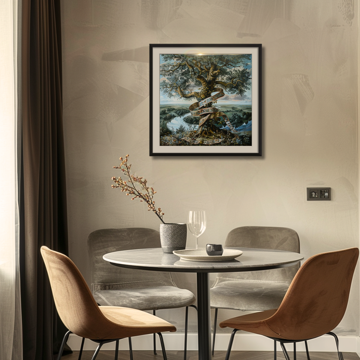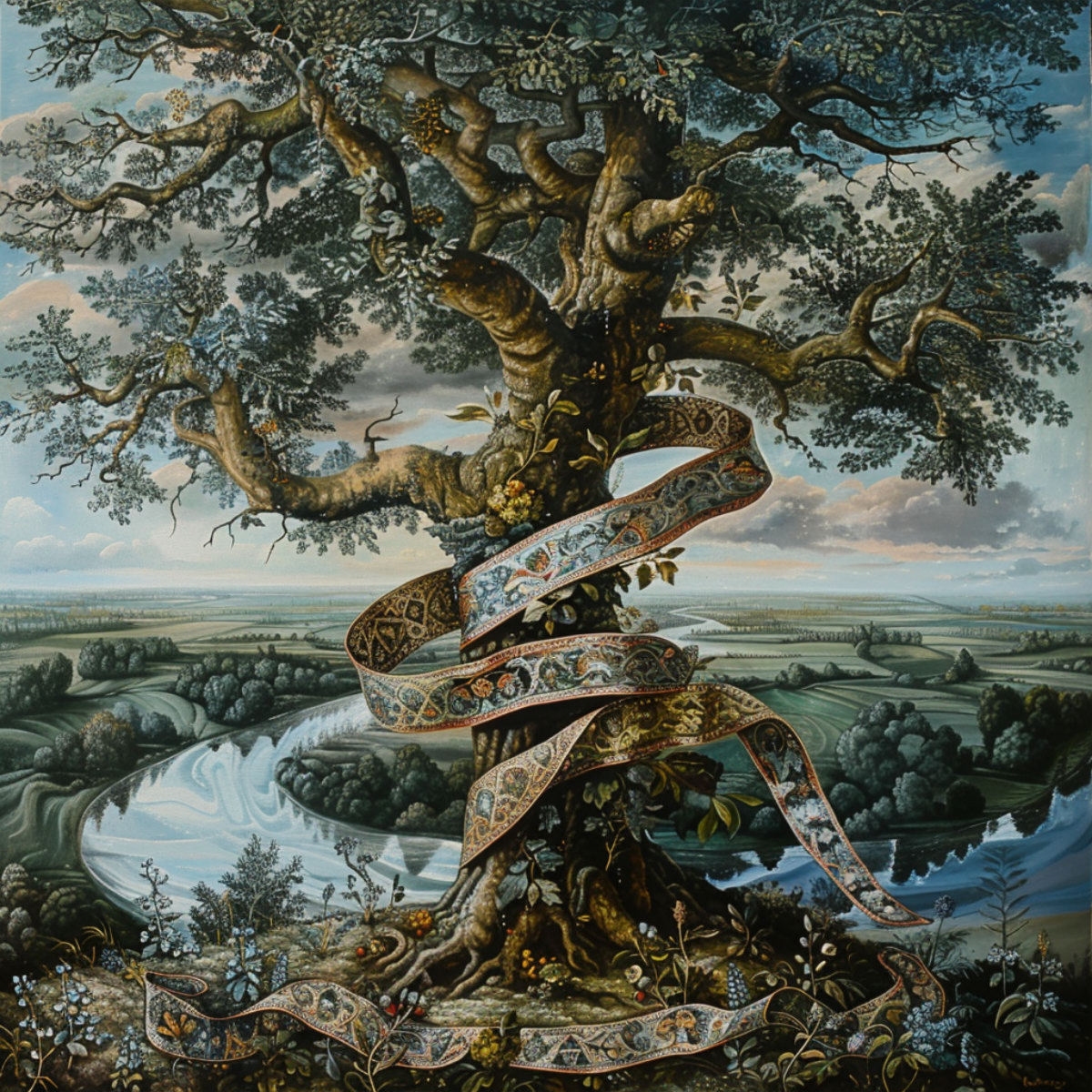This painting showcases a stylized oak tree, wrapped in a decorative ribbon with complex patterns. The detailed bark and lush foliage, contrasted with the elegant ribbon, represent the intricate relationship between health and nature. The oak tree stands as a symbol of strength and endurance, while the ribbon signifies the ongoing care and support vital for managing rheumatologic conditions. The combination of these elements aims to convey the depth and resilience found in both nature and human health.