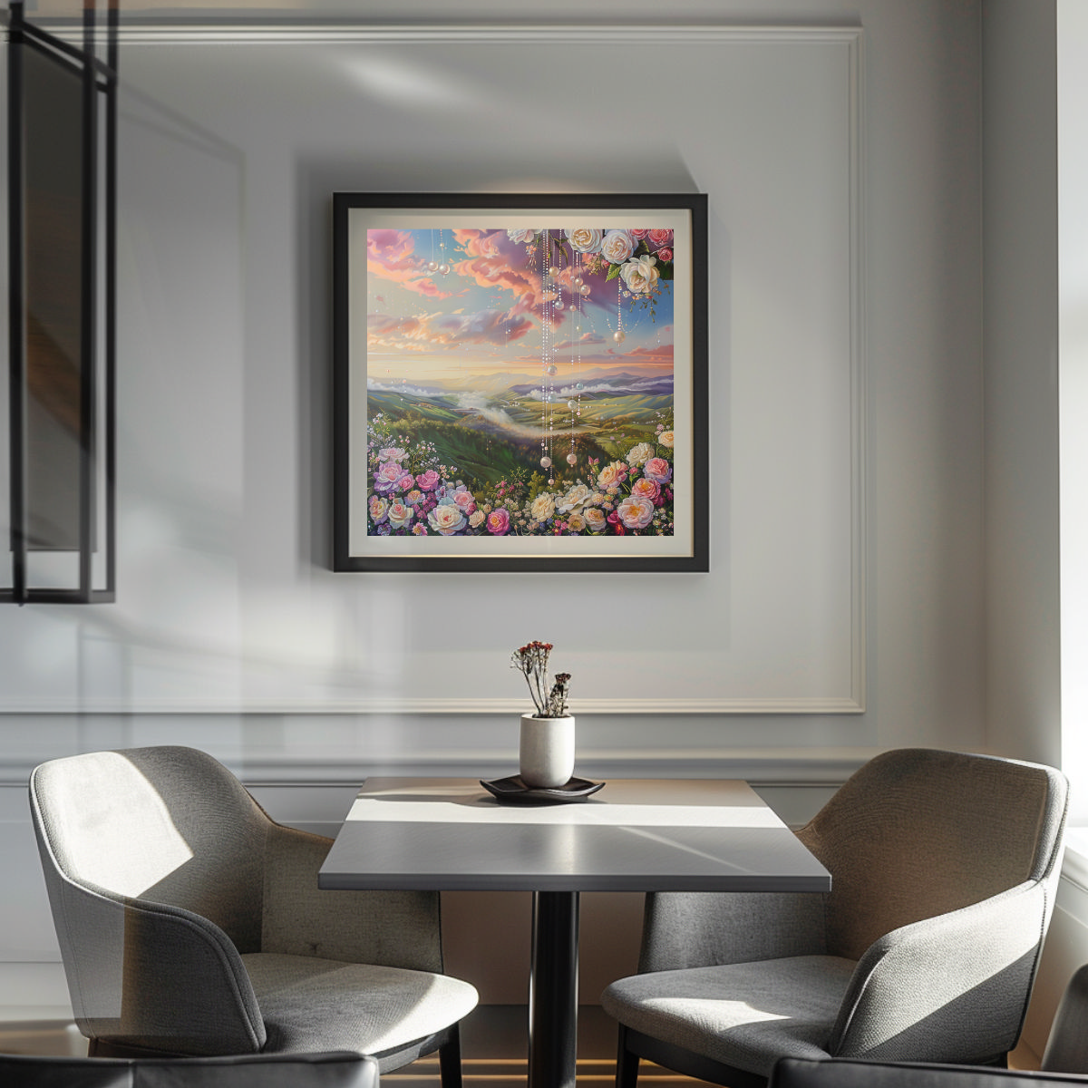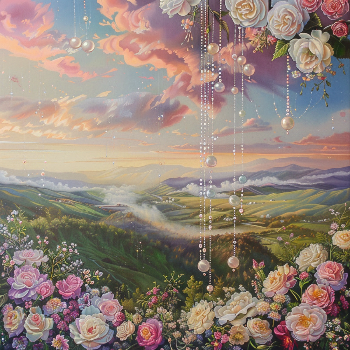 This artwork features pearls set against a whimsical floral backdrop, symbolizing the beauty and importance of dental health. The varying shades of blue, white, and pink create a dreamlike atmosphere, highlighting the purity and value of a healthy smile. The flowers, with their intricate details, represent the care and attention required for maintaining dental health, ensuring that our smiles remain as bright and precious as pearls.