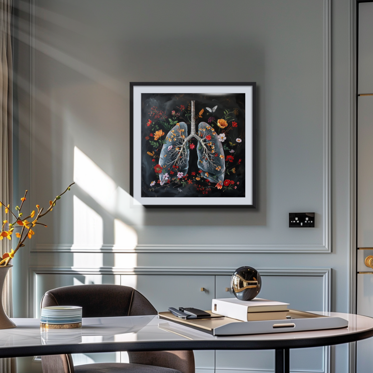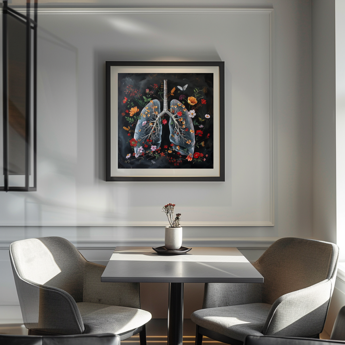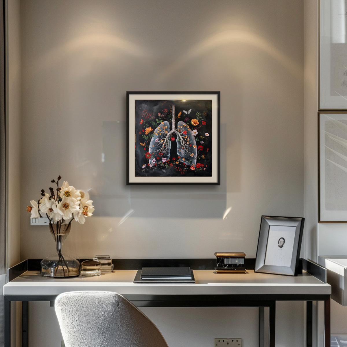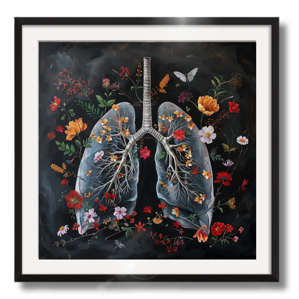 In this work, I wanted to emphasize the harmony between human anatomy and nature. The painting depicts lungs intertwined with bright flowers set against a dark background. The combination of pastel tones and vivid colors creates a striking contrast, conveying a sense of vitality and health. The unique style with imaginative elements highlights the importance of lungs in sustaining our health and vitality, emerging vibrantly from the shadows.