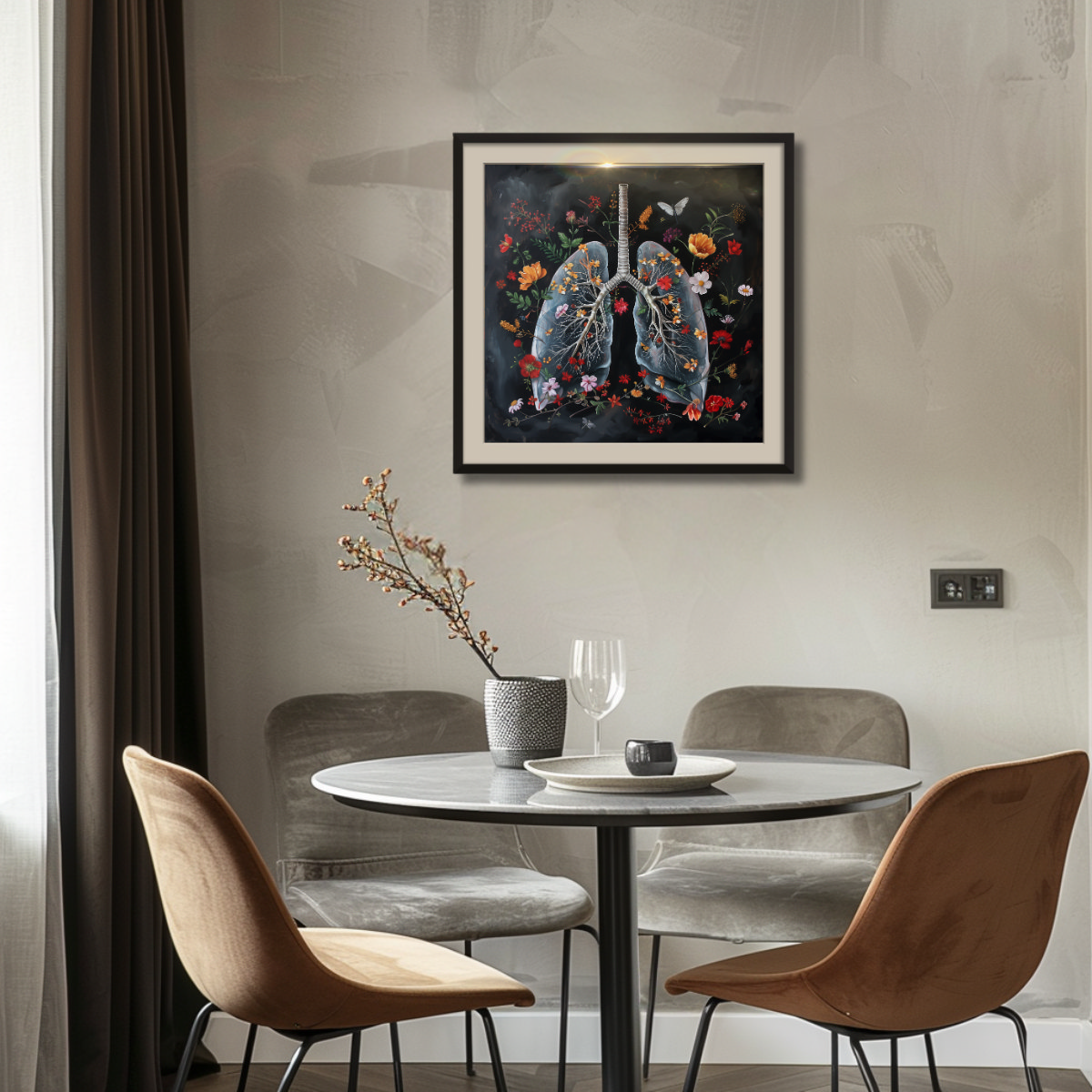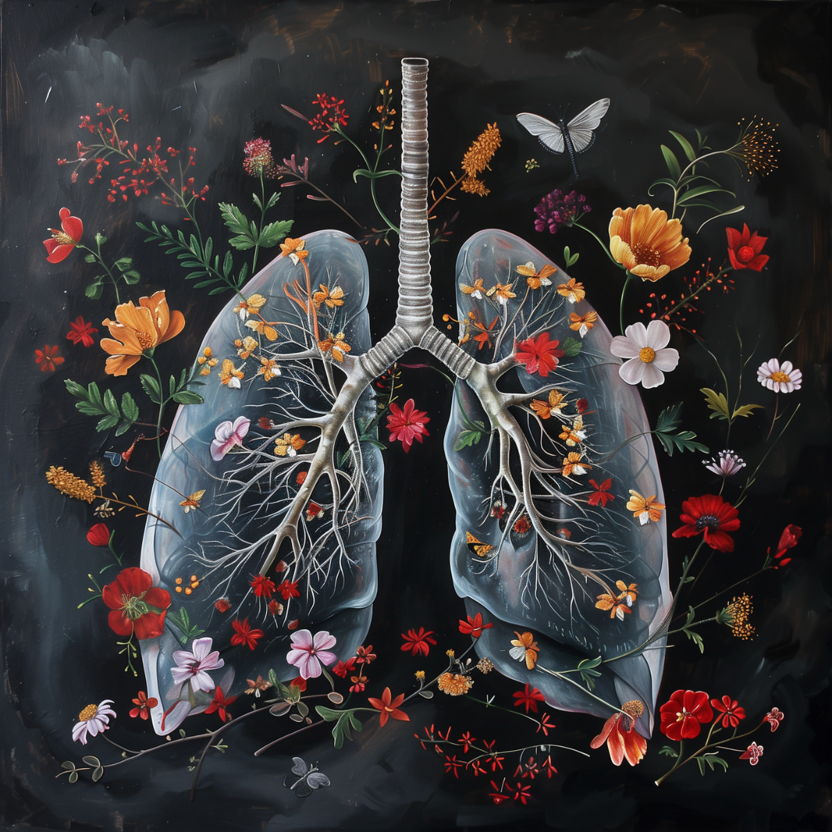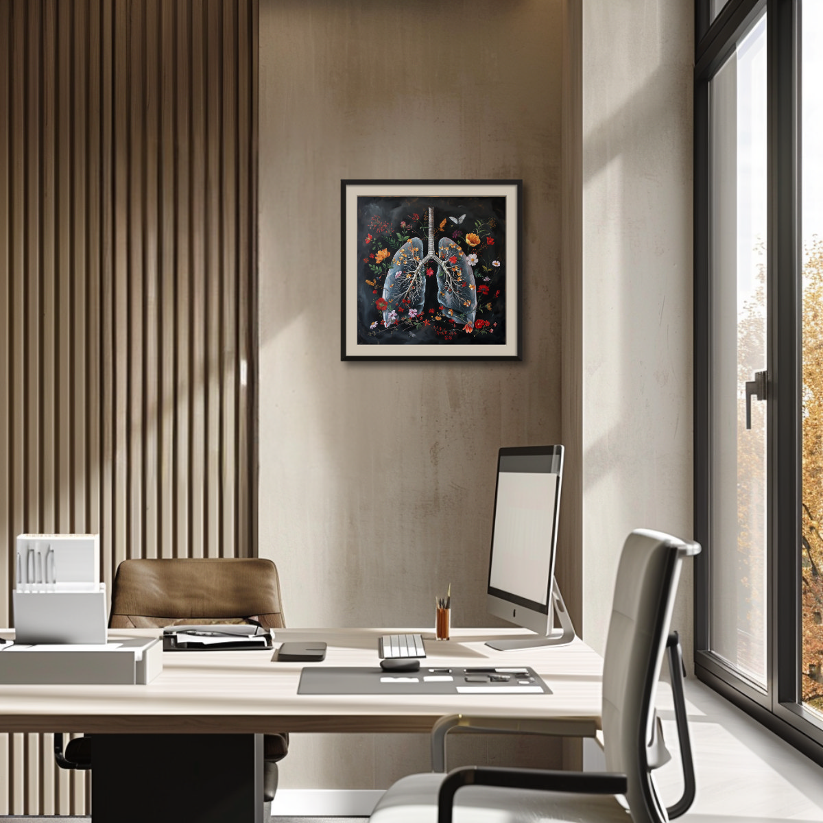 In this work, I wanted to emphasize the harmony between human anatomy and nature. The painting depicts lungs intertwined with bright flowers set against a dark background. The combination of pastel tones and vivid colors creates a striking contrast, conveying a sense of vitality and health. The unique style with imaginative elements highlights the importance of lungs in sustaining our health and vitality, emerging vibrantly from the shadows.
