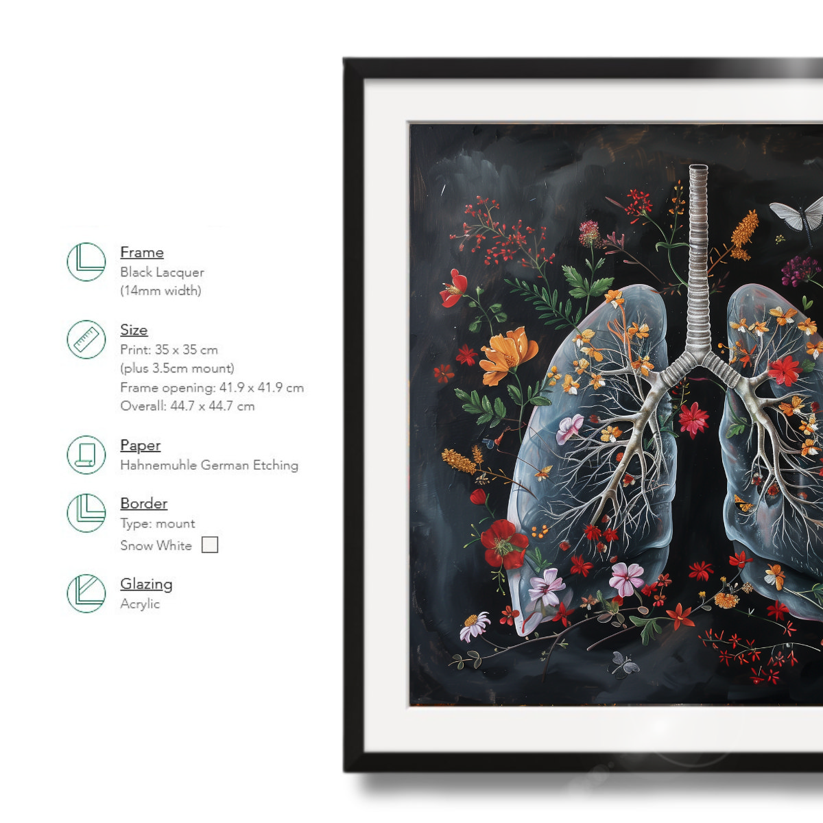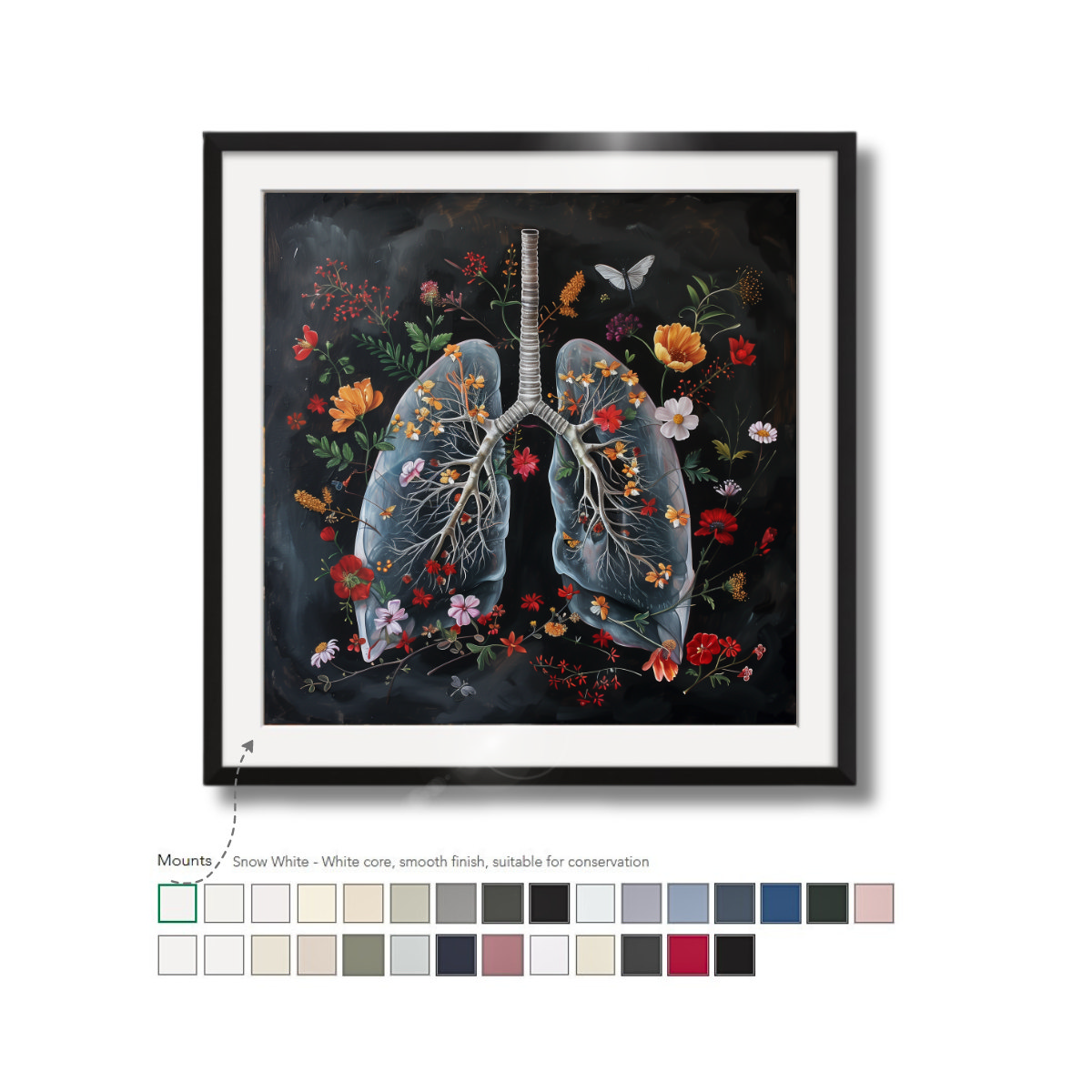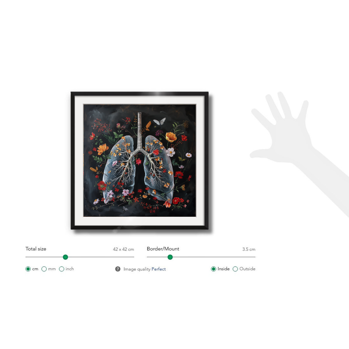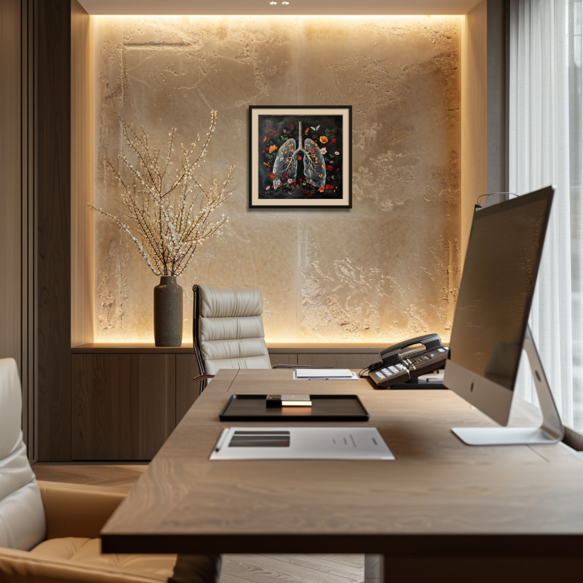In this work, I wanted to emphasize the harmony between human anatomy and nature. The painting depicts lungs intertwined with bright flowers set against a dark background. The combination of pastel tones and vivid colors creates a striking contrast, conveying a sense of vitality and health. The unique style with imaginative elements highlights the importance of lungs in sustaining our health and vitality, emerging vibrantly from the shadows.