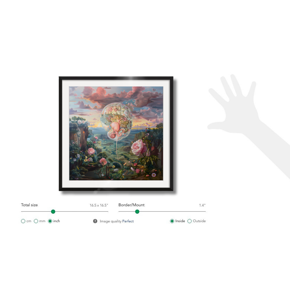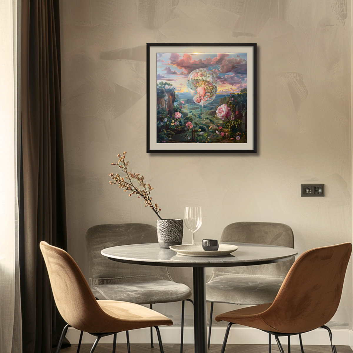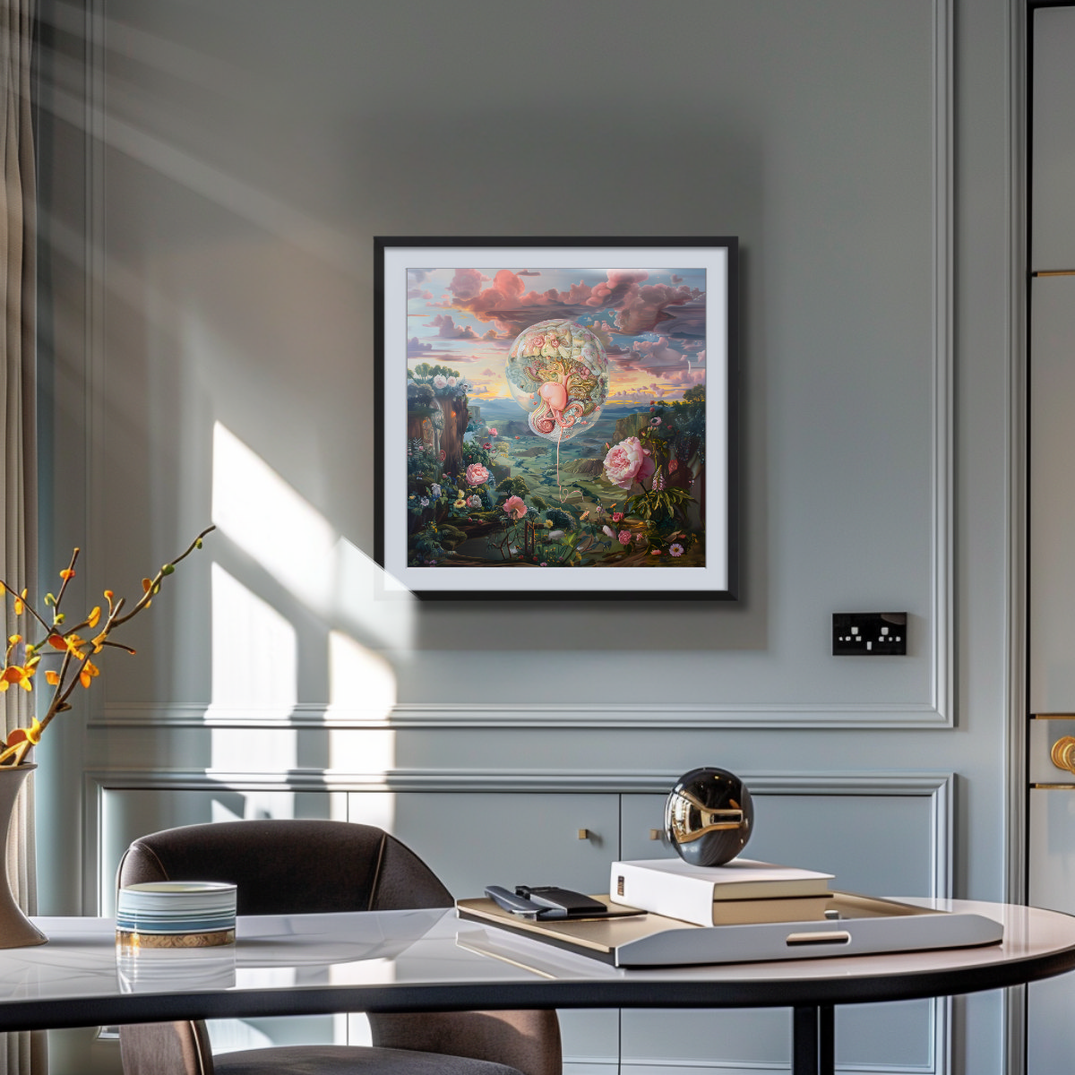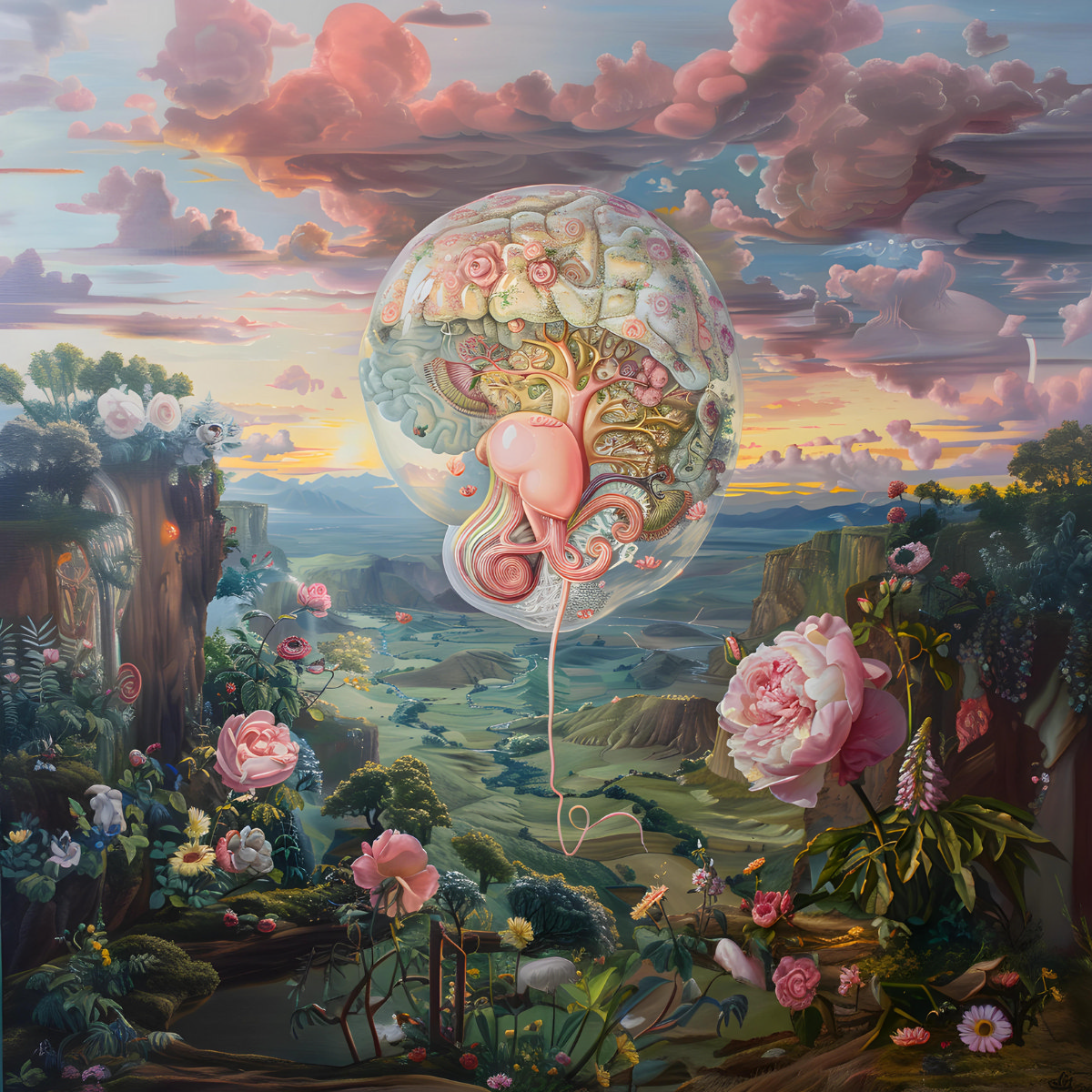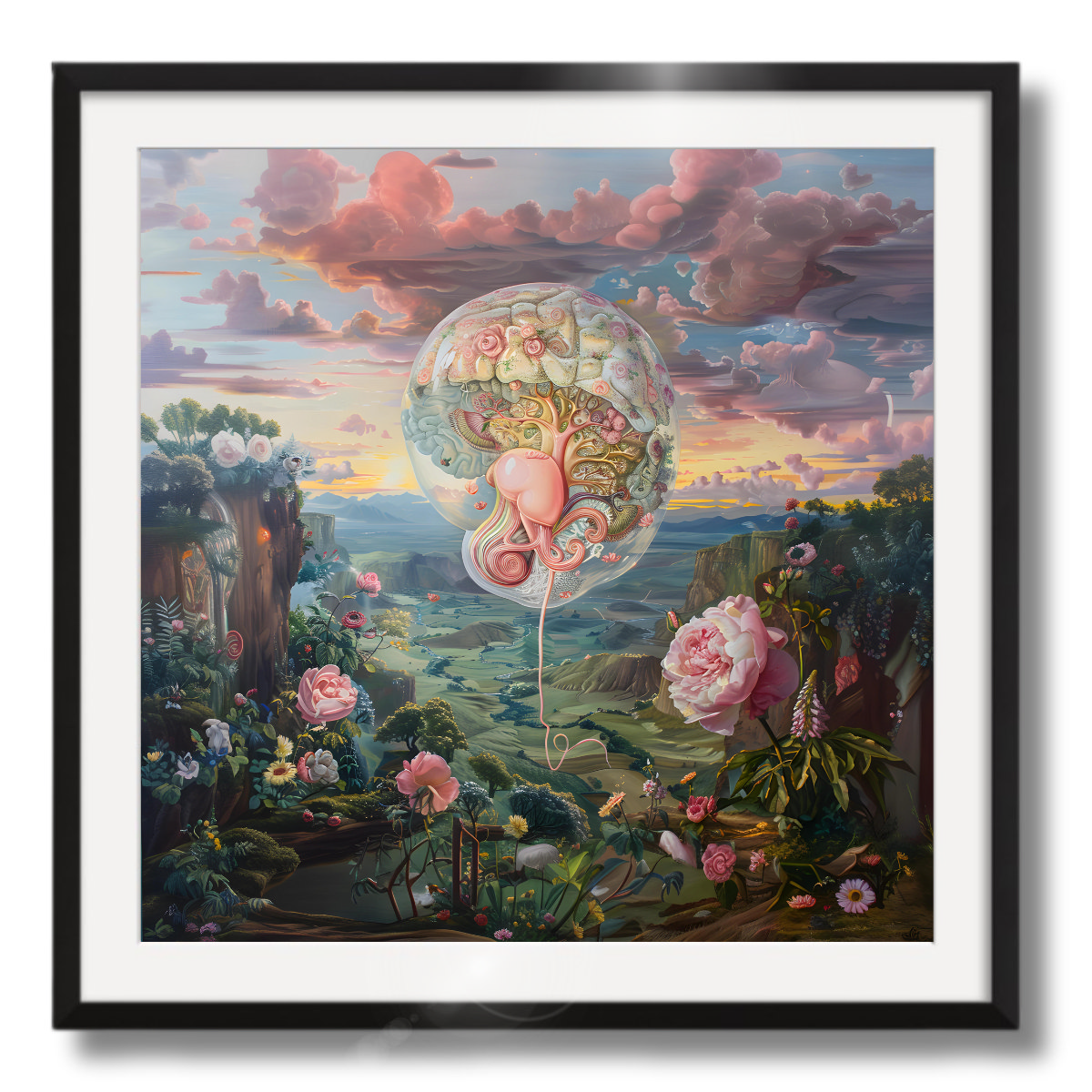 In this painting, a kidney is illustrated with a fantastical twist, adorned with delicate flowers. The soft pastels and vivid colors like pinks and yellows create a sense of warmth and renewal. The floral elements symbolize the regeneration and cleansing functions of the kidneys, highlighting the vital role they play in our body's health.